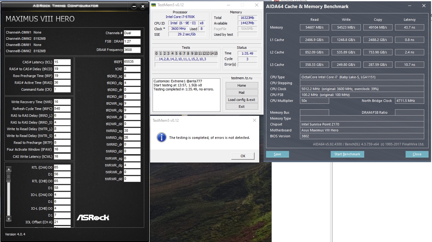 Здравствуйте. Сделал Коффемод последнего биоса ASUS M8H программатором, пинмод 9600kf (каптоном изолировал, фольгированным замыкал). Память стоит в слотах A2 и B2, как в мануале. Просто захотел посмотреть, заработает ли XMP (Знаю, XMP — зло), плата завелась только на 3866МГц, но ни одна программа, кроме CPU-Z не отображает частоту памяти (Со стоковыми JEDEC 2133 такая же проблема). Бенчмарк кэша и памяти AIDA64 вообще по нулям проходится.
