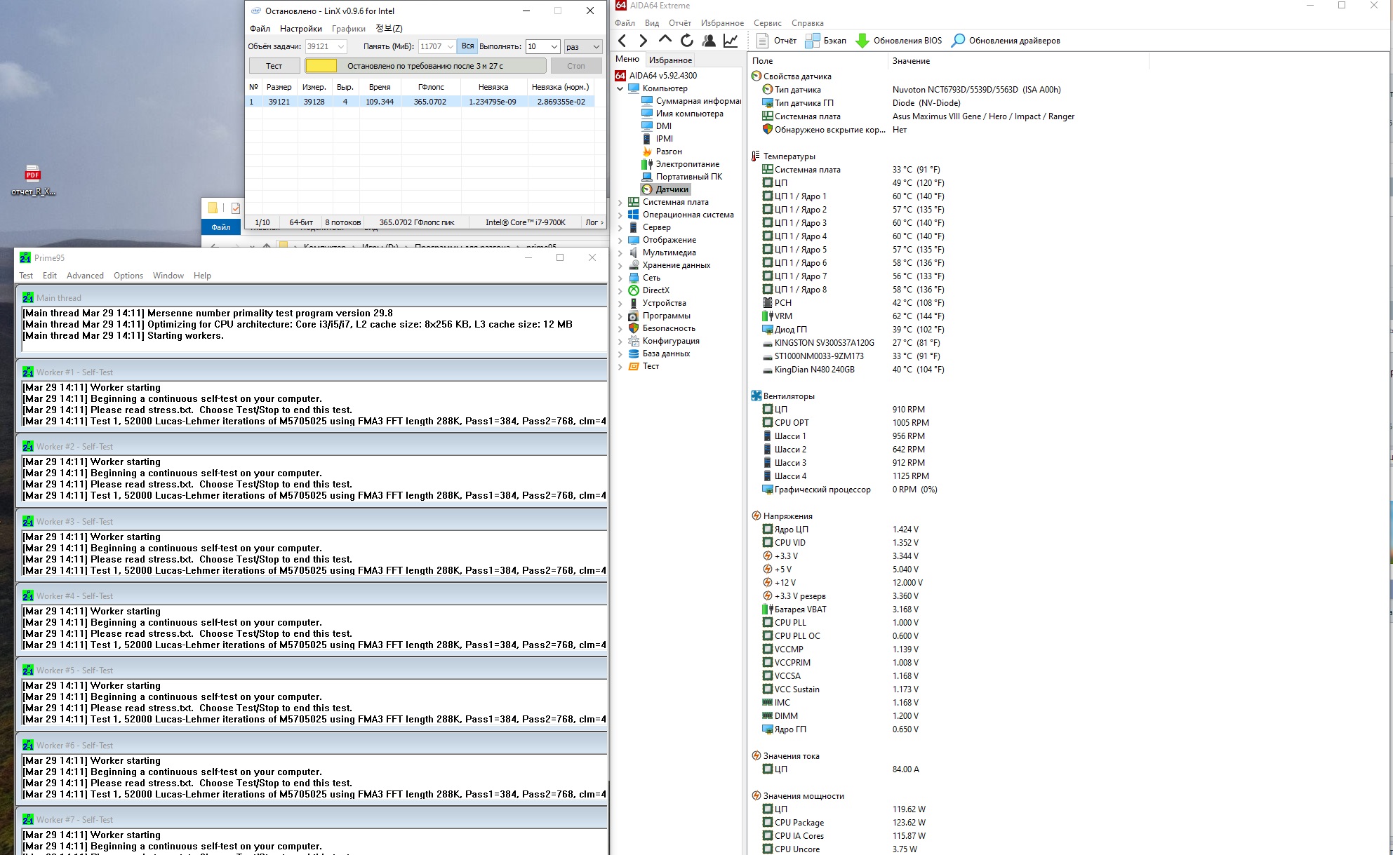 Подскажите пожалуйста может кто знает в какую сторону копать. Установил 9700к на сокет 1151 v1, на фото будет. Так вот проходит тесты типа тестмем5, синебенч, корону рендеринг, но вот линкс и прайм 95 не проходит ни в каую. Линкс зависает на 26-30 секунде так и не начав давать нагрузку. А прайм через секунд 5-10 синий эран. Есть подозрения на винду, она сильно захламлена, попробовал стрельцом линкс все равно не прошел. если камню дать вольтаж 1,45 то линкс 2 минуты идет потом вываливаются ошибки. Вольтаж камня 1,36, оперативы 1,38. s i/o 1,21 В играх вроде все хорошо, но спустя часов 5 бывает вылет. Есть подозрения куда копать?