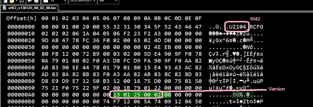 cat power, смотри хексом бинарник, если в заголовке U2104 это для 1042, 2104В это для 1042А. Версия прошивки выглядит: год месяц число, дадьше 6 знаков это как бы основной номер, ее можно тоже увидеть в бинарнике