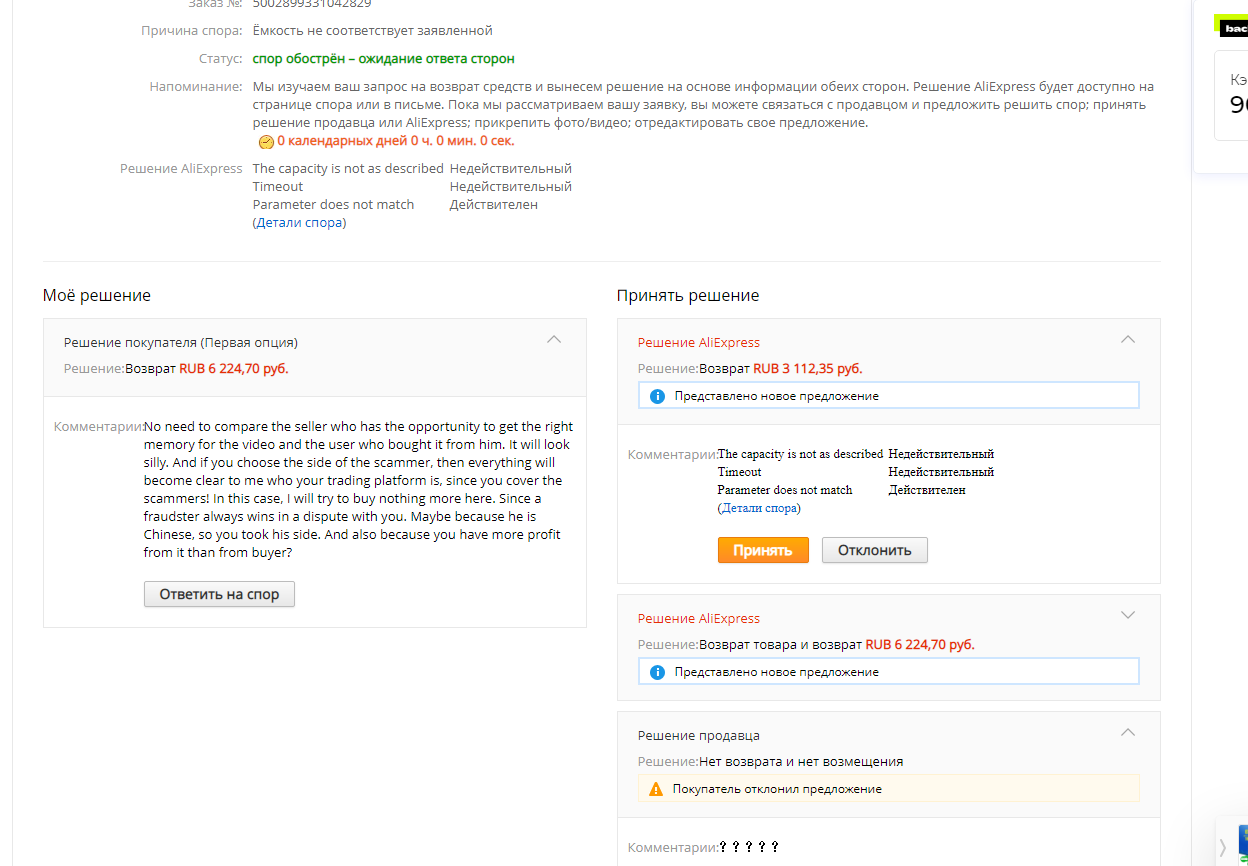 innervizionman Это ему ещё повезло. У меня продавец даже не парился. Разонал оперативку до 1600Mhz и продал её как 1866Mh. Все 4 планки памяти были прошиты одним файлом с одним серийником. У них там мошенничество в промышленных масштабах происходит. А прощадка либо сама в этом участвует либо закрывает на это глаза. Мне ещё тоже повезло, что спор частично решился в мою пользу. При чём я не заметил сперва. Там было 2 выбора либо компенсация 50% от стоимости оперативки либо возврат товара с моей стороны и возврат денег со стороны охамевшего продавца. Я дурик выбрал сперва 1ый вариант, потом второй... Потом правда 2ой вариант отменил, но чёт не знаю что да как дальше будет.. Продавец ведь тоже может отказаться или выберет 2ой вариант, а он мне не выгоден.