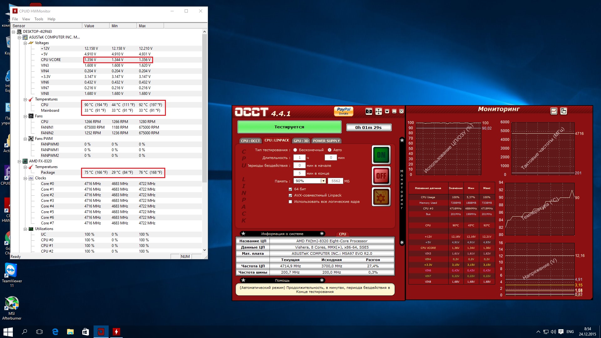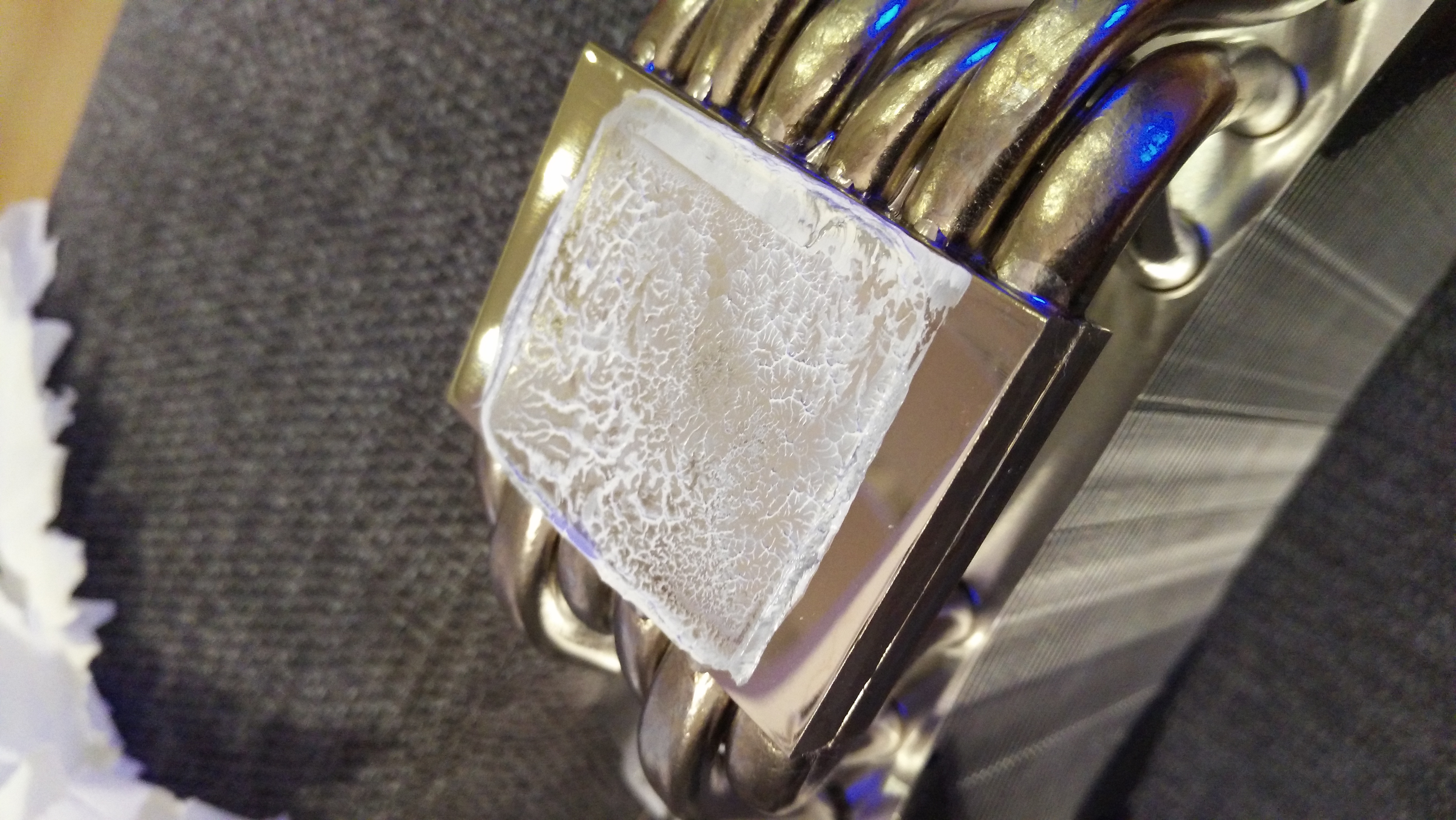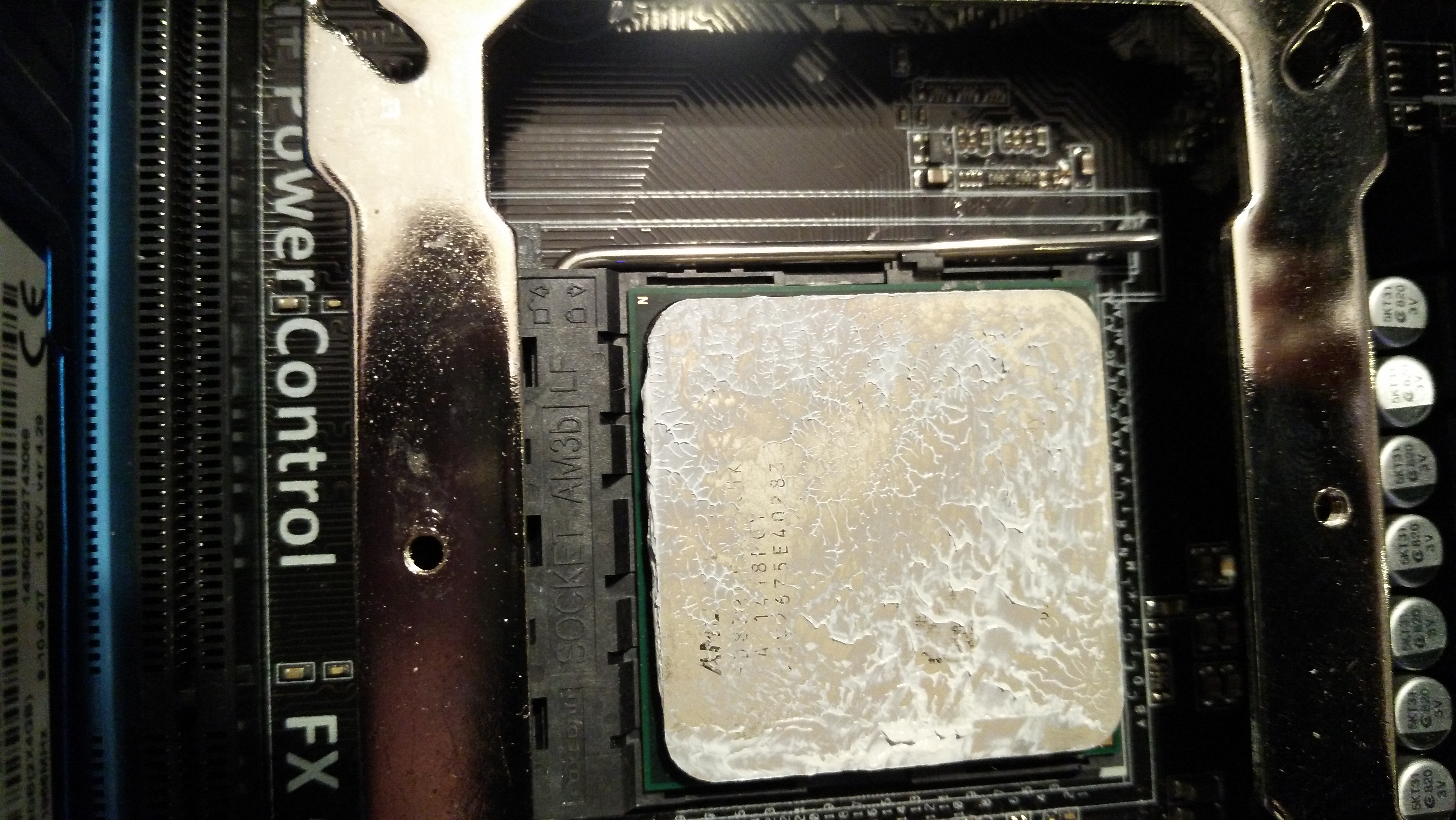 Нет, просто тротлить начинает.... На прошлой матери M5A97 LE R2.0 тротлинг начинался при 61 градусе. У меня полное ощущение, что это не температура процессора, а VRM... Подумал бы что брак матери, но на прошлой матери было все тоже самое. Кулер вчера снимал, пробовал в горячую воду запихать. Мгновенно нагреваются и ребра и тепловые трубки все. А тут по датчику 90 градусов, а трубки не горячие даже. Больше похоже что реальную температуру показывает датчик "Package" из HWMonitor'а... Про напряжение в 1.4-1.5 вообще можно и не думать... Кулер на VRM корпусной поставил 120мм... На полных оборотах в 1200. ВРМ горячий конечно все равно, но рука терпит. Посему у меня несколько идей: 1. Всетаки VRM или NB нагревают датчик на матери с которого, по идее, и снимаются эти высокие показатели 2. Внутри проца плохой контакт между кристаллом\крышкой. Но тут надо думать почему оно тогда в играх на напряжении 1.35 спокойно работает при 4.7Ггц. Скальпировал ли кто то 8320? Есть ли в этом смысл? 3. Плохая термопаста. В комплекте, судя по пакетику, первая версия Thermalright Chill Factor, а не вторая как во всех обзорах. По крайней мере цифры II на пакете нет. Просто Thermalright Chill Factor. Ну не может же термопаста так плохо проводить тепло? Это не термопаста тогда получается, а "анти термопаста" 4. Какие то глюки - как исправить ХЗ