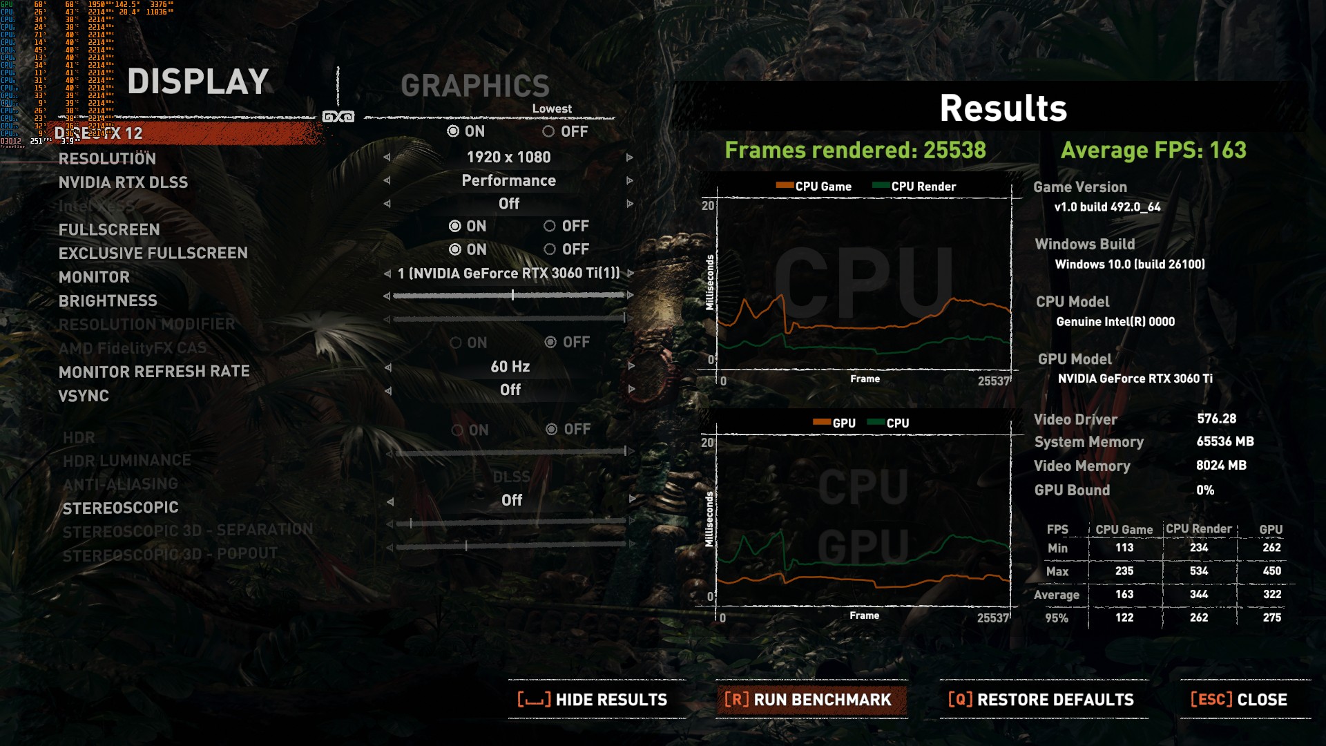 Это упор в ВК, поэтому в Ларе написано GPU bound - 100% в обоих случаях. GPU bound - это показатель упора в ВК, если половину кадров был упор в проц, тут будет 50%. Можешь ставить хоть 9800x3d, будет такой же ФПС c 3060ti.