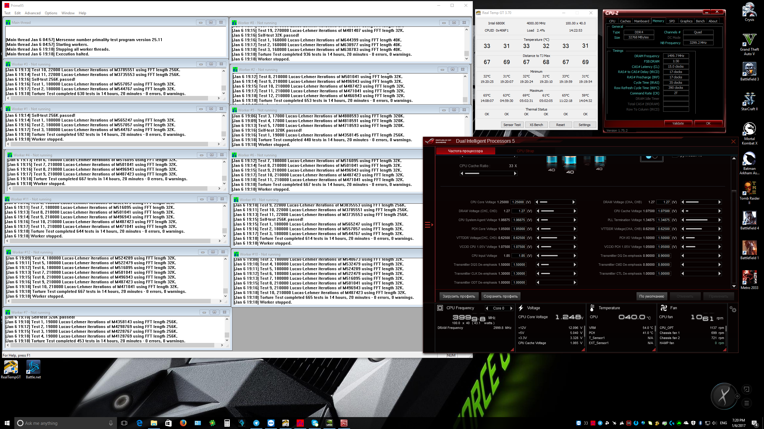 Посвятил сегодня день выявлению стабильных напряжений для разгона. Разгонял офсетом, в итоге вышло 4.2GHz при 1.248V. Для AVX офсет-4. Подробные настройки под спойлером.