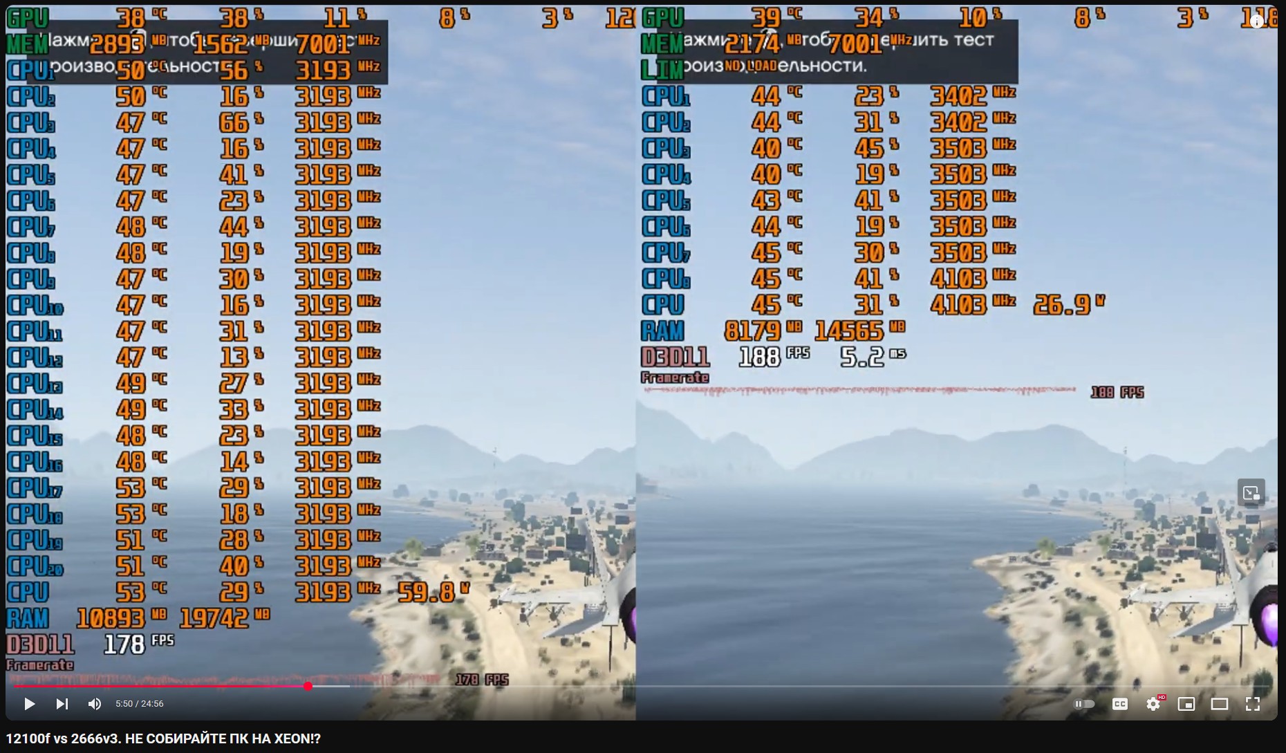 Посмотрите какой ровный фремйрейт у 4-х ядерного 12100, по сравнению с 10-ти ядерным Ксеоном при одинаковом fps на последнем скриншоте. Чем он занят, если у него +6 свободных ядер и они все готовы работать.