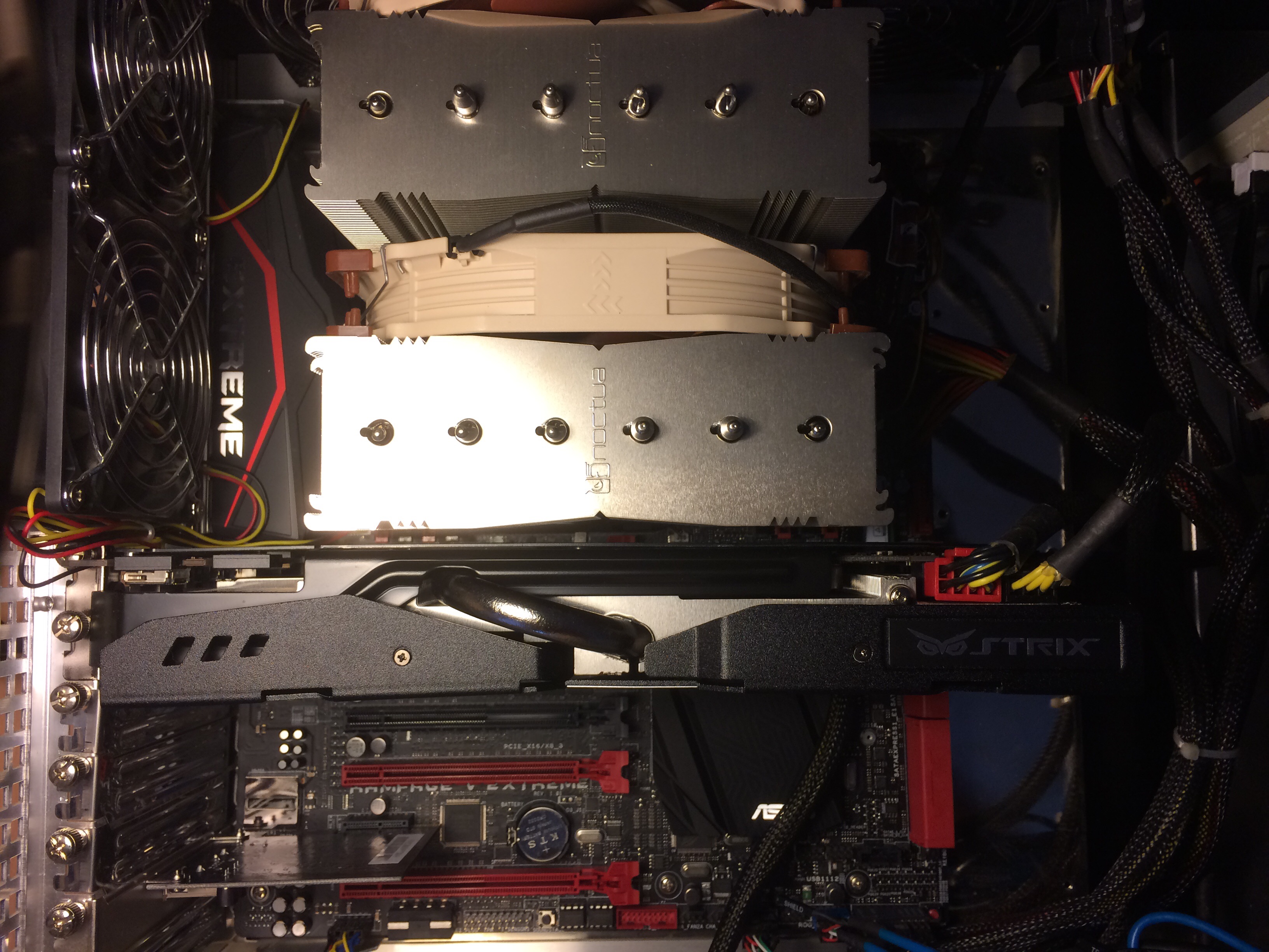 Отличное фото ! Видно, что нижняя секция почти не продувается и загнутые пластины только ухудшают циркуляцию воздуха при такой установке. Я кстати добавил третью вертушку на NH-D14.