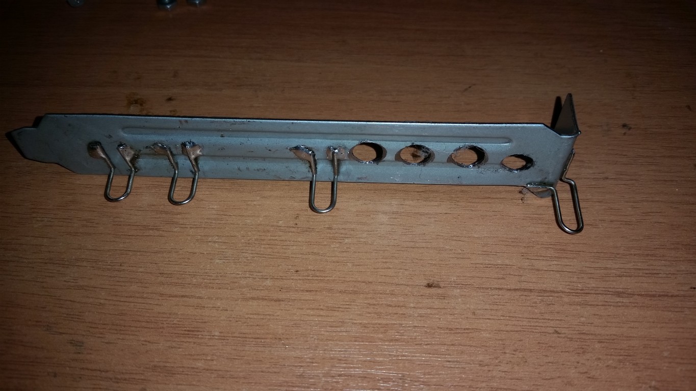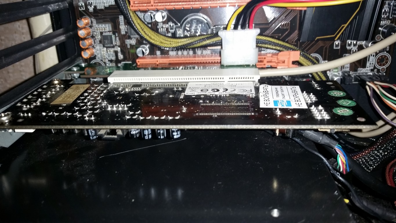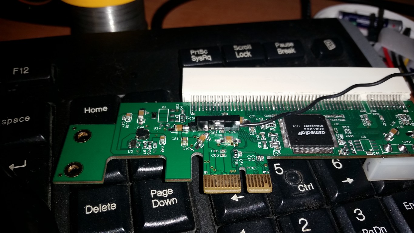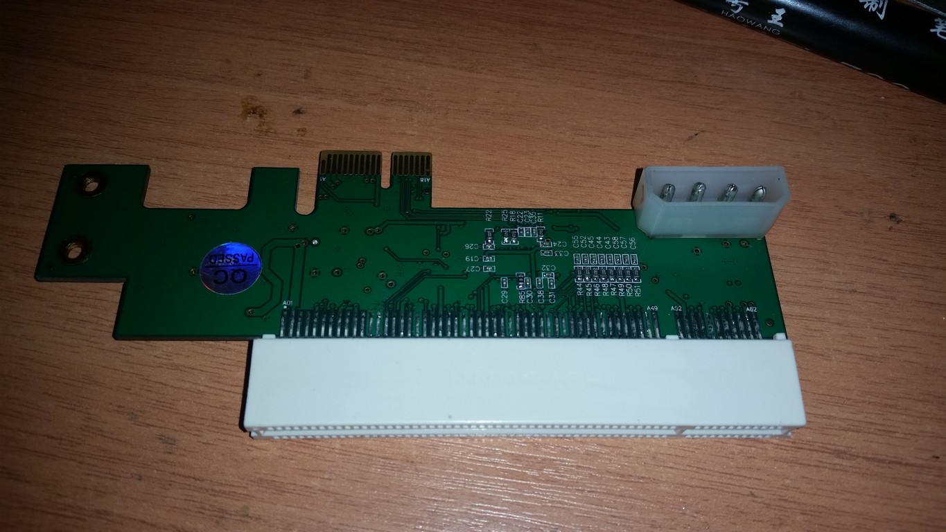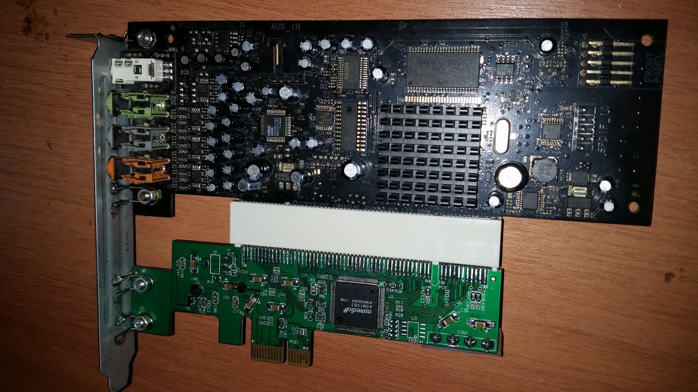 Есть у меня хорошая звуковая карта, X-FI Extreme Gamer, звук отличный, 3D, EAX там всякие, кочует из компьютера в компьютер, но PCI. Как её воткнуть в рыжика без PCI? Есть у китайцев такой чудо переходник. Он работает, карту комп определяет, драйвера ставятся, но звука нет. Проблема в том, что на шине pci-e нет -12в нужных для усилителя в нормальных звуковухах. Я подпаял проводок к шлейфу -12 разъема atx24(синий провод) c разъемчиком на конце, и напаял иголочку-штекер на переходнике (контакт b01). И поставил нормальный разъем molex. Самая проблема была сделать заднюю планку, но все получилось.