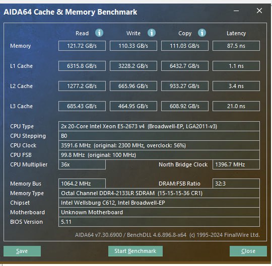 посмотри внимательно. у него частота 2133, вместо твоих 2400. и тайминги не ужаты. результаты его теста говорят о там, что плата и железо работает штатно. а вот с твоей 100нс задержкой явно что-то не здоровое.