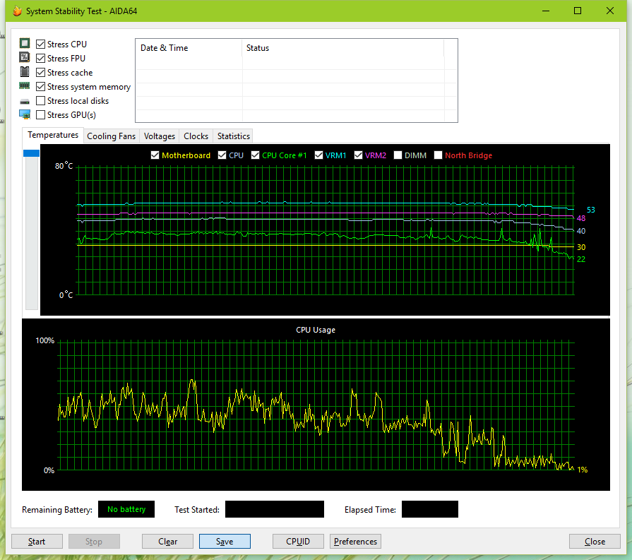 OldBrave, спасибо за разъяснение моей проблемы, теперь полностью понял её причину. Теперь хочется разобраться в её решении. Завтра попробую перепрошить биос на более старый и затем отпишусь о температурах. Что касается программ мониторинга, то в данный момент в моей системе стоит AIDA64 и MSI Afterburner(с ним же и RivaTuner), AISuite отсутствует. В программе мониторинга AIDA стоит частота опроса 4 секунды, но скачки всё равно присутствуют. Может ли MSI Afterburner виноват в этом?