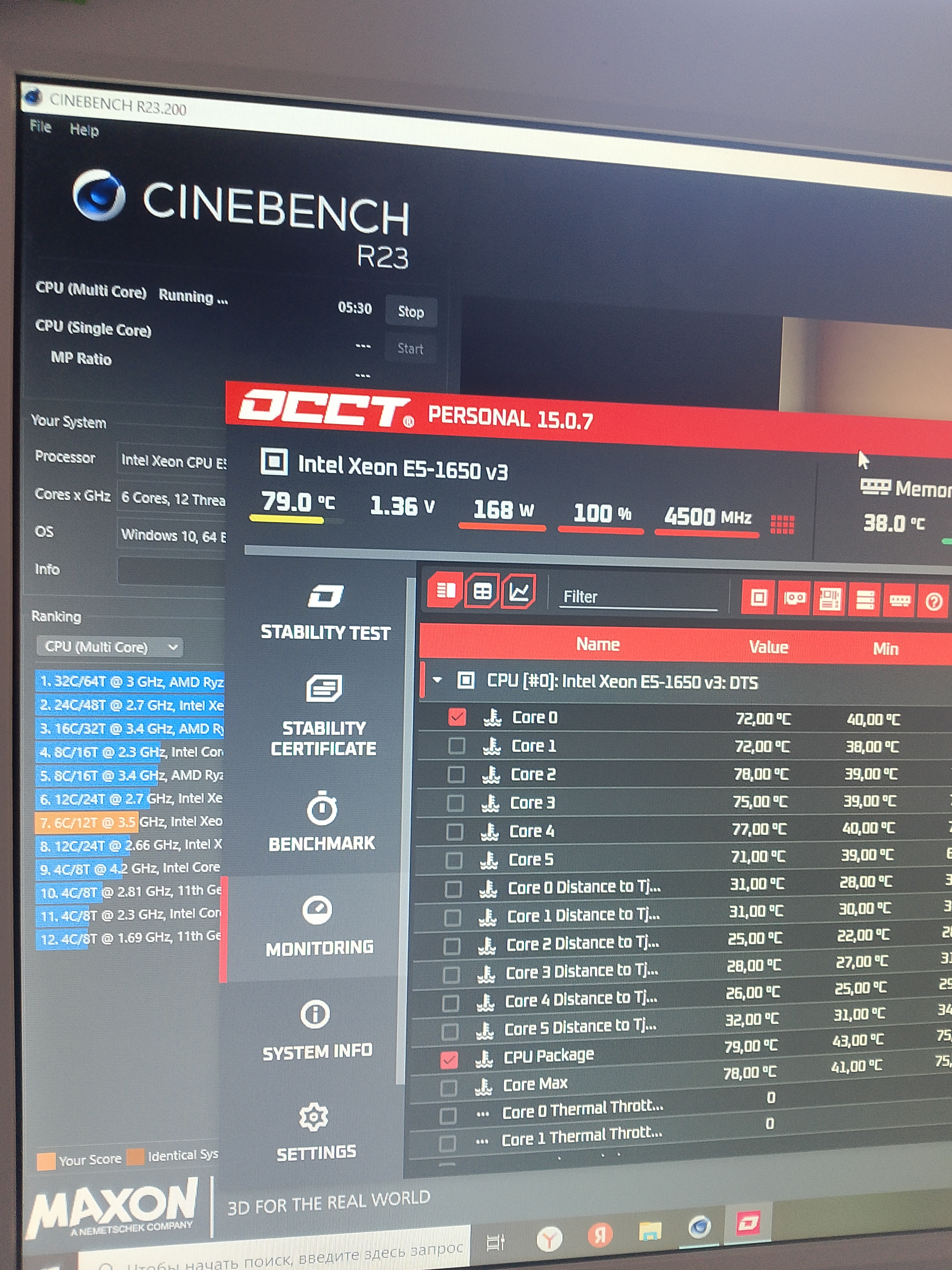 Жидковато! Если - разгон ради разгона - надо идти дальше и глубже. 2011-3 - не пробовал, нет фирменной МП, рабочие результаты на 2011-1 - ниже. Подробности - питание на процессор 1,4-1,425v, память Патриот 1866 cl10, питание 1.7-1,725v, кулер - Люцифер, термопаста TFХ. С памятью в 4х-канале - процессор - примерно так же, но память выше 2400 - не удалось завести никак - с любыми таймингами и напряжением. На клиентском ПК на MCI с 1650v2 и комплектом оверклокерской памяти с XMP 2400 под двухвентиляторным Thermalright Silver Arrow система завелась на 5,2 ГГц, питание 1,48 v, память 3000 cl14, питание 1,75v, CPU Package - 190+ Вт. Но тесты стабильности крашились через 3-4 минуты - раз за разом, хотя перегрева не было, даже при подъёме памяти до 1,5v. Пройти 20-ти минутный тест удалось только на 5,13 ГГц, к концу теста температура ядер упорно держалась в диапазоне 80-85*С при любых оборотах вентиляторов кулера - видимо произошёл упор в теплопередачу крышки процессора.
