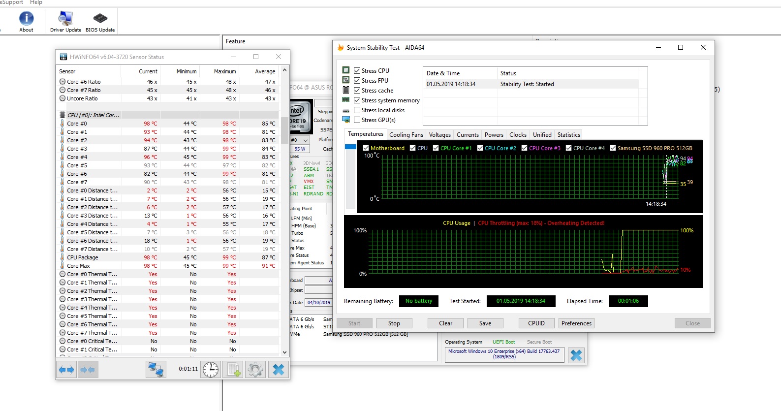 Прошу помощи с разгоном Core i9-9900k на мат. плате ASUS ROG STRIX Z390-H GAMING. И да, я в курсе, что данная мат. плата далеко не лучший выбор для данного камня. Начну немного с предыстории: В принципе, меня все устраивало со штатным турбобустом на авто настройках с XMP оперативки, кроме температуры. Данная мать выкручивала VCore до 1.44В на данный ЦПУ на авто, и как следствие температура до 95 градусов, что соответственно меня не устраивало. И это на 3-х секционной водянке. Я решил вручную зафиксировать на частоте 4.7Ghz при напряжении 1.24В, температура процессора после чего не поднималась выше 80 градусов (стресс-тесты не берем в расчет) в необходимых мне задачах и тяжелых играх. Все настройки в BIOS, которые я произвел: - зафиксировал частоту 4,7Ghz (Sync All Cores) - вольтаж 1,24В - LLC - 6 уровень (и путем мониторинга выявил, что это лучший уровень) - Long и Short Duration Package Power Limit - максимум (4095) - CPU Core/Cache Current Limit Max. - максимум (255.75) - Package Power Time Window - максимум (127) - Current Capability - максимум (170%) - IA AC и DC Load Line - 0,01 - Intel SpeedStep, Speed Shift Technology, CPU C-states - вcе Disabled - ASUS MultiCore Enchancement - Disabled - VCCIO и VCCSA - 1.20 В - ОП в режиме XMP - 3400 Mhz при вольтаже 1.35
