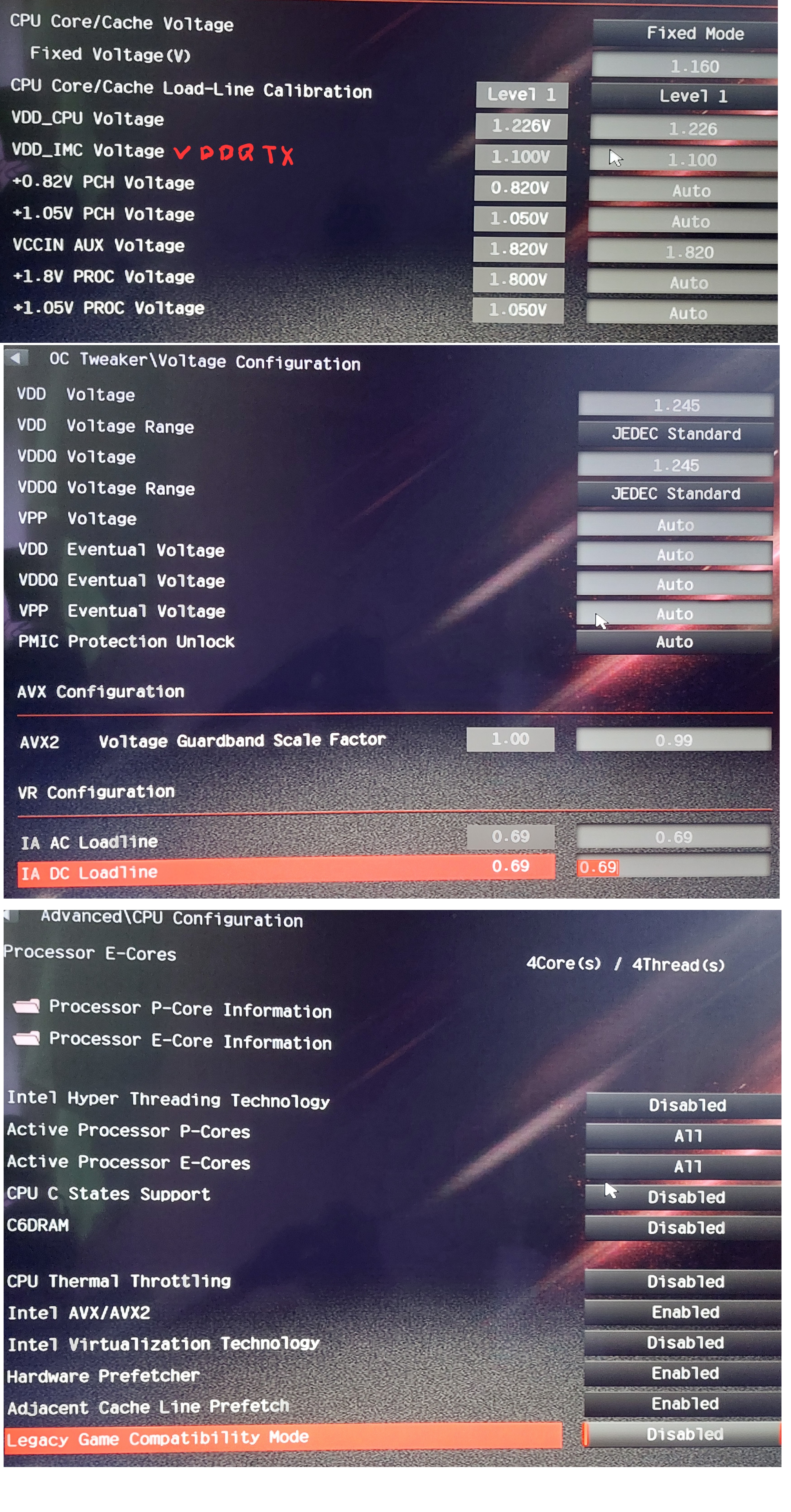 Приветствую! Являюсь обладателем Asrock z790 pro rs wifi, проц 13600к, память gskill ripjaws ddr5 6000 16x2. Нигде не могу найти руководство по разгону 13го покаления. Весь интернет только 12е, причём на матерях z690 msi или gigabyte... но названия вольтажей и др параметров очень разняться... не получается разогнать мой 13 используя инфу с 12го покаления. Старею... потому что я пришёл в недоумение хотябы от того, что в bios аж три параметра калибровки напряжения и ведут они себя странно, мягко говоря. Думал забью, оставил весь bios на авто, кроме P-ядра 54 на все, а Е-ядра 42 на все. Включаю стресстест, t° 90 максимум, по самому горячему, знач водянка тянет, всё должно быть гут, но нет, через 10мин экран смерти... Я можт пропустил нужную мне ветку по разгону? Покажите дорогу, пожалуйста, где научиться, опять и снова заново
