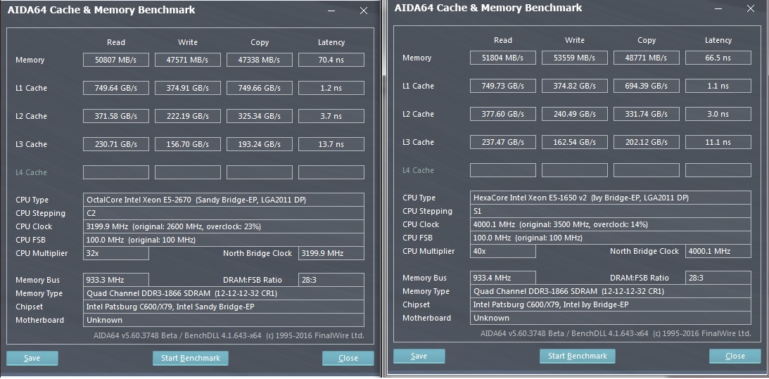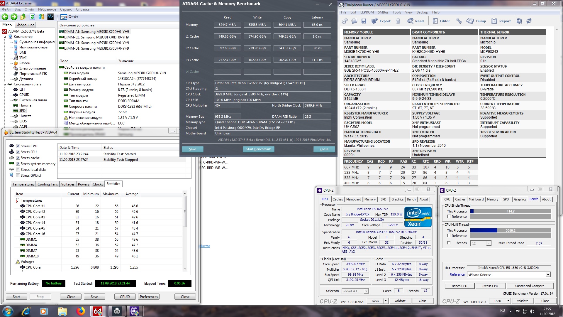Всем привет! Хочу поделится "переездом" с e5-2670 на e5-1650v2. При установке процессора скорее всего перетянул винты на башне кулера, так как при установке 1650 мать (кстати huanan 4.27 одна из первых которые были до рыжих и зеленых) стартанула но не издала ни писка, а только черный экран и крутящиеся вентиляторы. Когда ослабил винты все заработало. Все проверил в биосе. Загрузил винду без разгона -все хорошо. Потом разогнал проц до 4.0 и память до 1866. Получил просадки по чтению до 33 мб\с. Решил что мои самсунги DDR3L не вывозят с этим процессором хотя с 2670 все было хорошо. Снизил до 1600, тоже самое.. А оказывается надо было после смены скорости памяти презагружать комп принудительно, китаец сам этого не делает как бренды. И после этого получил сакральные 50+мб\с на 1866 Так что кому пришлют DDR3L 1333 не спешите расстраиваться они тоже могут! 1650 конечно же горячее чем 2670. В прайм и линекс не гонял, но в аиде 10 минут прогрели до макс до 58с. Максимально еще не гнал.. Может быть потом дополню сколько максимально удалось получить. Переходил с 2670 на 1650 из за игрушек.. В сетевые не бегаю но в warhammer 2 нагрузка на проц снизилась до 70-90% на ядро. До этого всегда одно ядро на 2670 пыхтело 100%. Но все равно уперлось в вк 1060-100%. В разрешении 2К, Borderlands 2 frametime стал заметнее плавнее нет жестких скачков как на 2670. Мое сугубое впечатление быстрее стали подрузки.. карт и уровней.. Но могу и ошибаться))) Во общем переездом доволен скрины прилагаю.