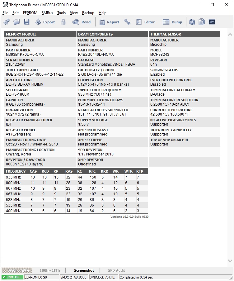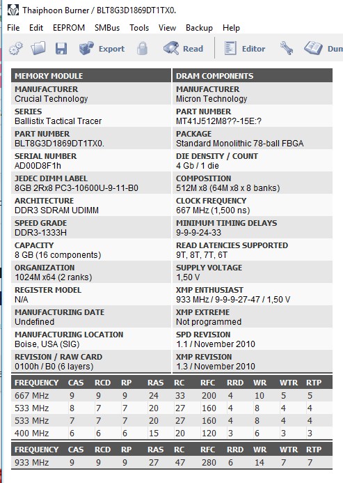MEMORY MODULE Manufacturer Samsung Series Not determined Part Number M393B1K70QB0-CMA Lot Number W07O000 Serial Number 02938D9Dh JEDEC DIMM Label 8GB 2Rx4 PC3-14900R-12-12-E2 Architecture DDR3 SDRAM RDIMM Speed Grade DDR3-1866M Capacity 8 GB (36 components) Organization 1024M x72 (2 ranks) Register Manufacturer IDT Register Model A1 (Evergreen) Manufacturing Date January 26-30 / Week 05, 2015 DRAM COMPONENTS Manufacturing Location Onyang, Korea Revision / Raw Card 0000h / E2 (10 layers) Manufacturer Samsung Part Number K4B2G0446Q-BCMA Package Standard Monolithic 78-ball FBGA Die Density / Count 2 Gb Q-die (35 nm) / 1 die Composition 512Mb x4 (64Mb x4 x 8 banks) Clock Frequency 933 MHz (1,071 ns) Minimum Timing Delays 13-13-13-32-44 Read Latencies Supported 13T, 11T, 10T, 9T, 8T, 7T, 6T Supply Voltage 1,50 V XMP Enthusiast Not programmed XMP Extreme Not programmed THERMAL SENSOR SPD Revision 1.2 / September 2013 XMP Revision Undefined Manufacturer Microchip Model MCP98243 Revision 01h Sensor Status Enabled EVENT Output Control Disabled Temperature Accuracy B-Grade Temperature Resolution 0,2500 °C (10-bit ADC) Current Temperature 40,250 °C Negative Measurements Supported Interrupt Capability Supported 10V of VHV on A0 pin Supported