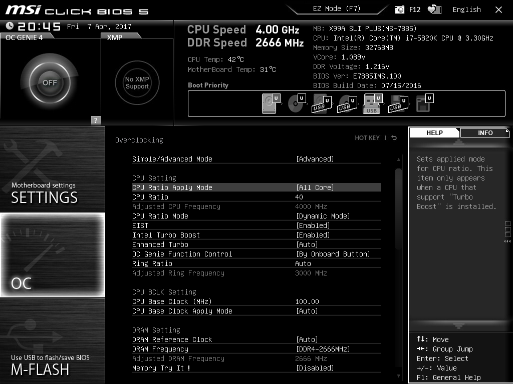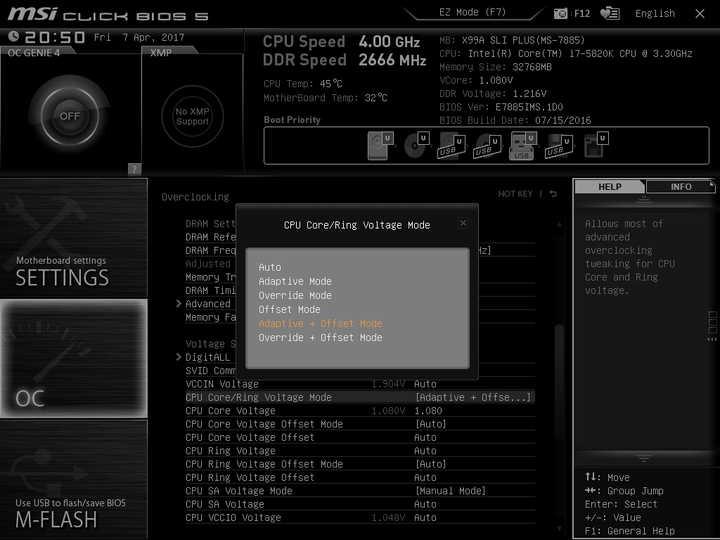 Пару слов про MSI X99A SLI PLUS, когда взял эту плату на первых биосах пробовал напряжение на процессор подавать офсетом, но в то время как то не заладилось, коряво эта функция работала на плате, пришлось пользоваться постоянным напряжением и в простое процессора она не падала, в отличии от частоты ядер, прошлым летом поставил биос 1.D, но лень тогда было экспериментировать, благо мой 5820к не требует высоких напруг и поэтому 1.08v(требуемое процессору для 4.0ггц) или 0.7v в простое было как то фиолетово, хоть и не эстетично. Вообщем на крайнем биосе решил заморочиться, и как итог функция работает корректно