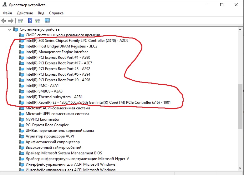 Intel(R) Xeon(R) E3 - 1200/1500 v5/6th Gen Intel(R) Core(TM) PCIe Controller (x16) - 1901 Ребят ставлю винду, устанавливаю с Asrocka драйвера, дальше включаю инет, жду если вдруг что винда поставит. А вот именно на это устройство может поставить драйвер только стороння программа, меня это не устраивает, где скачать драйвера на эти устройства? Выручайте, весь инет прошуршил. Еще вдобавок куда ставит драйвера стороння программа. Intel(R) 300 Series Chipset Family LPC Controller (Z370) - A2C9 Intel(R) Host Bridge/DRAM Registers - 3EC2 Intel(R) PCI Express Root Port #1 - A290 Intel(R) PMC - A2A1 Intel(R) Thermal subsystem - A2B1 Intel(R) Xeon(R) E3 - 1200/1500 v5/6th Gen Intel(R) Core(TM) PCIe Controller (x16) - 1901