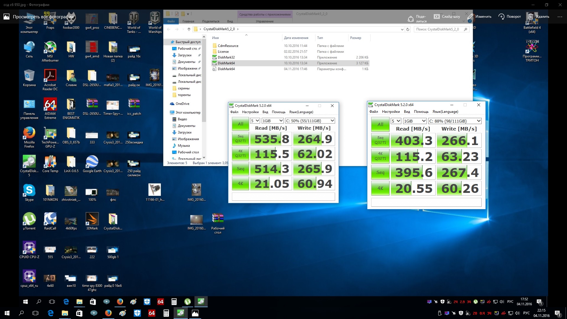 avtoelectrik версия? какая разница если тестируешь одной и той же на одной системе.. у тебя упор в твой SSD и разница в 2мб - это погрешность, запусти еще разок и увидишь другие цифры в новой версии есть пауза между проходами - это позволяет восстанавливать скоростные хар-ки SSD .. на старой же нет таких настроек и нет задержек- по этому скорость на цифрах падает - отображает реальные цифры , а не скорость кэша и т.п. но все же - скорость интерфейса выше скоростных хар-к вашего SSD #77