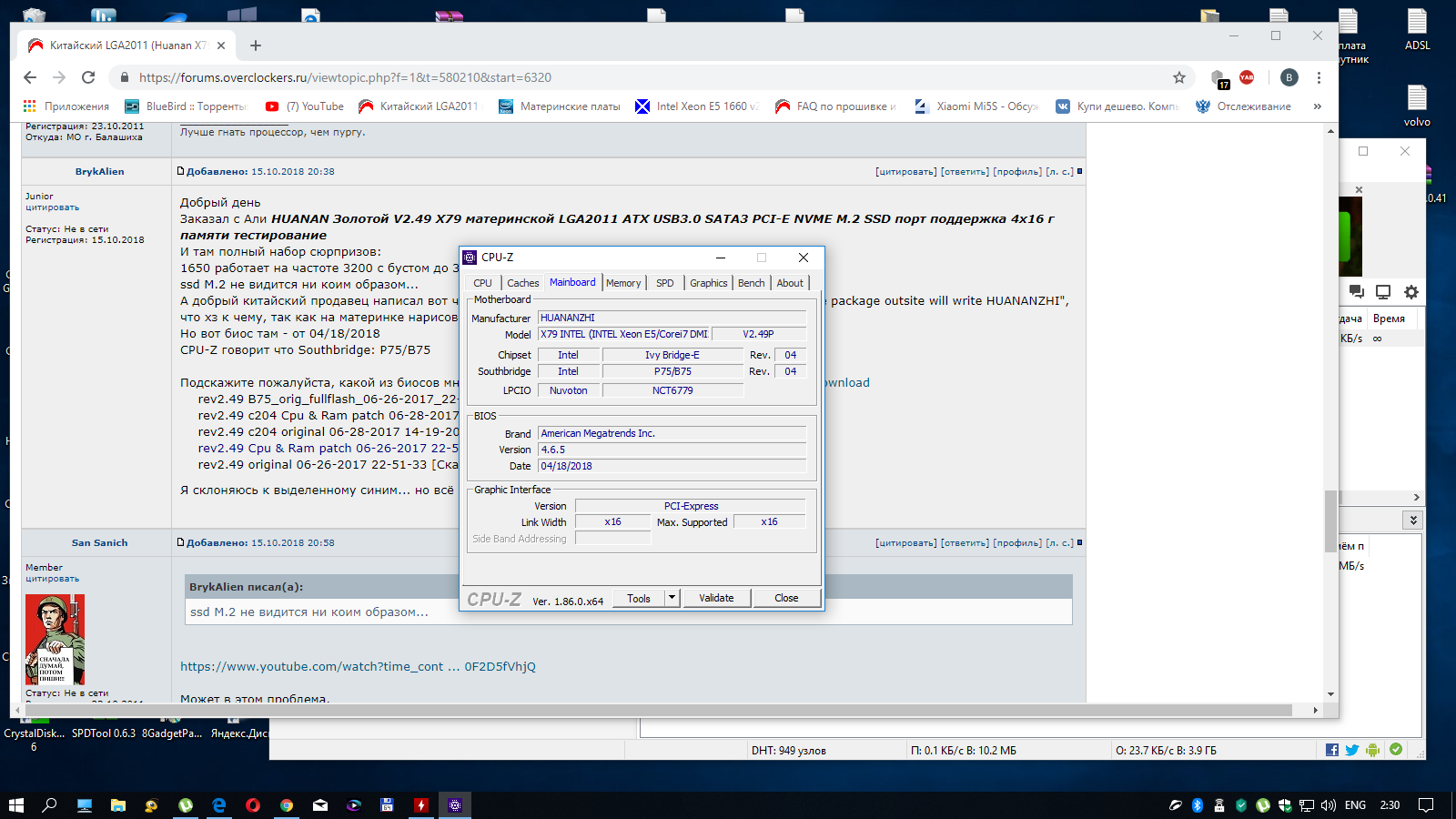 Добрый день Заказал с Али HUANAN Золотой V2.49 X79 материнской LGA2011 ATX USB3.0 SATA3 PCI-E NVME M.2 SSD порт поддержка 4x16 г памяти тестирование И там полный набор сюрпризов: 1650 работает на частоте 3200 с бустом до 3900 ssd M.2 не видится ни коим образом... А добрый китайский продавец написал вот что: "we update the board's version to 2.49P or 2.49,. and the package outsite will write HUANANZHI", что хз к чему, так как на материнке нарисовано именно HUANAN E5 VER:2.49 Но вот биос там - от 04/18/2018 CPU-Z говорит что Southbridge: P75/B75