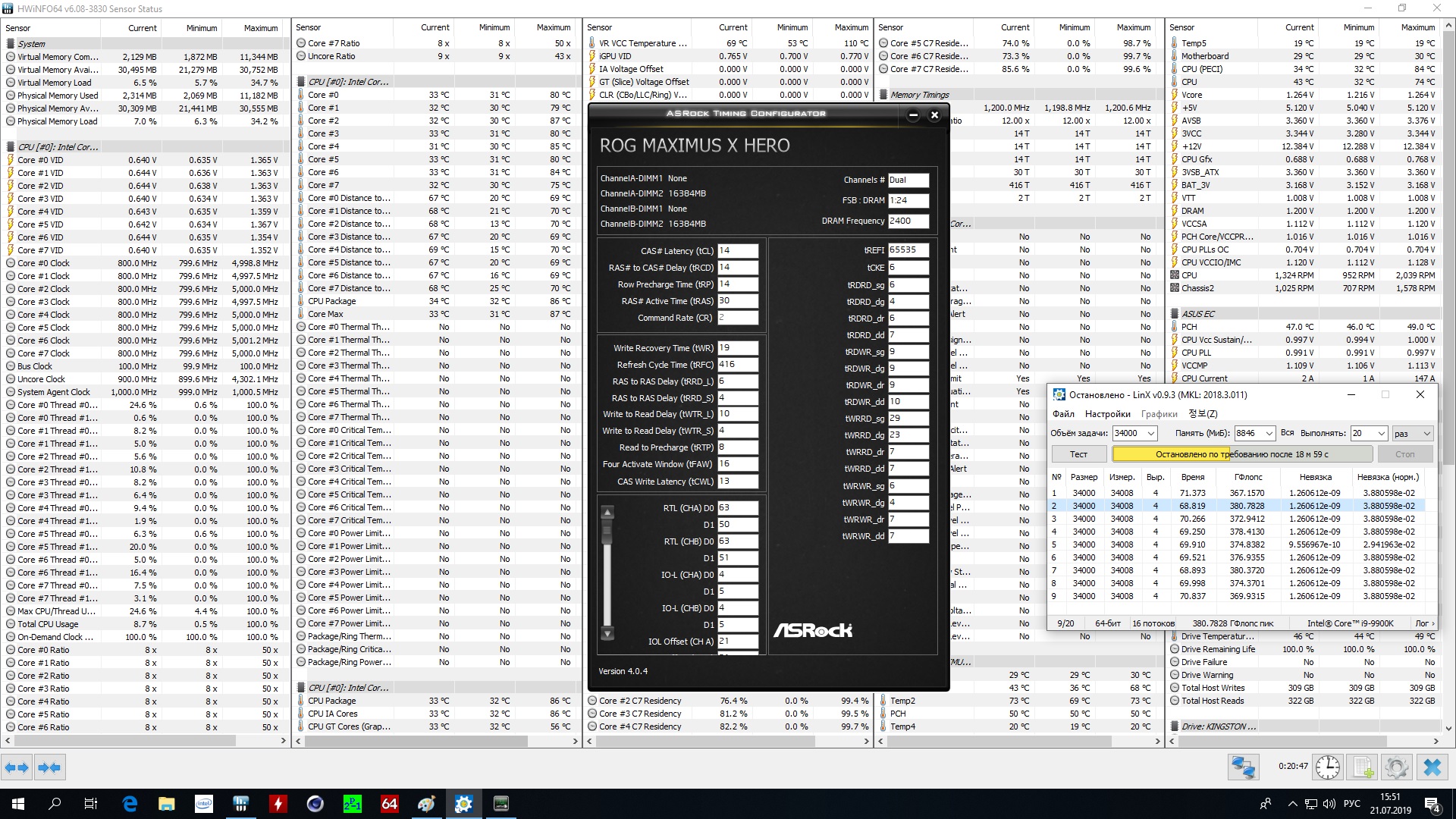 На частоте 3200MHz (14-14-14-30 CR2) должно быть больше 400 ГФлопс, при частоте 4.7GHz на все ядра, либо был отключен MCE, тогда у тебя верно, будет меньше 400 ГФлопс на частоте 3200 с таймингами CL14. Я сейчас как раз с памятью ***.