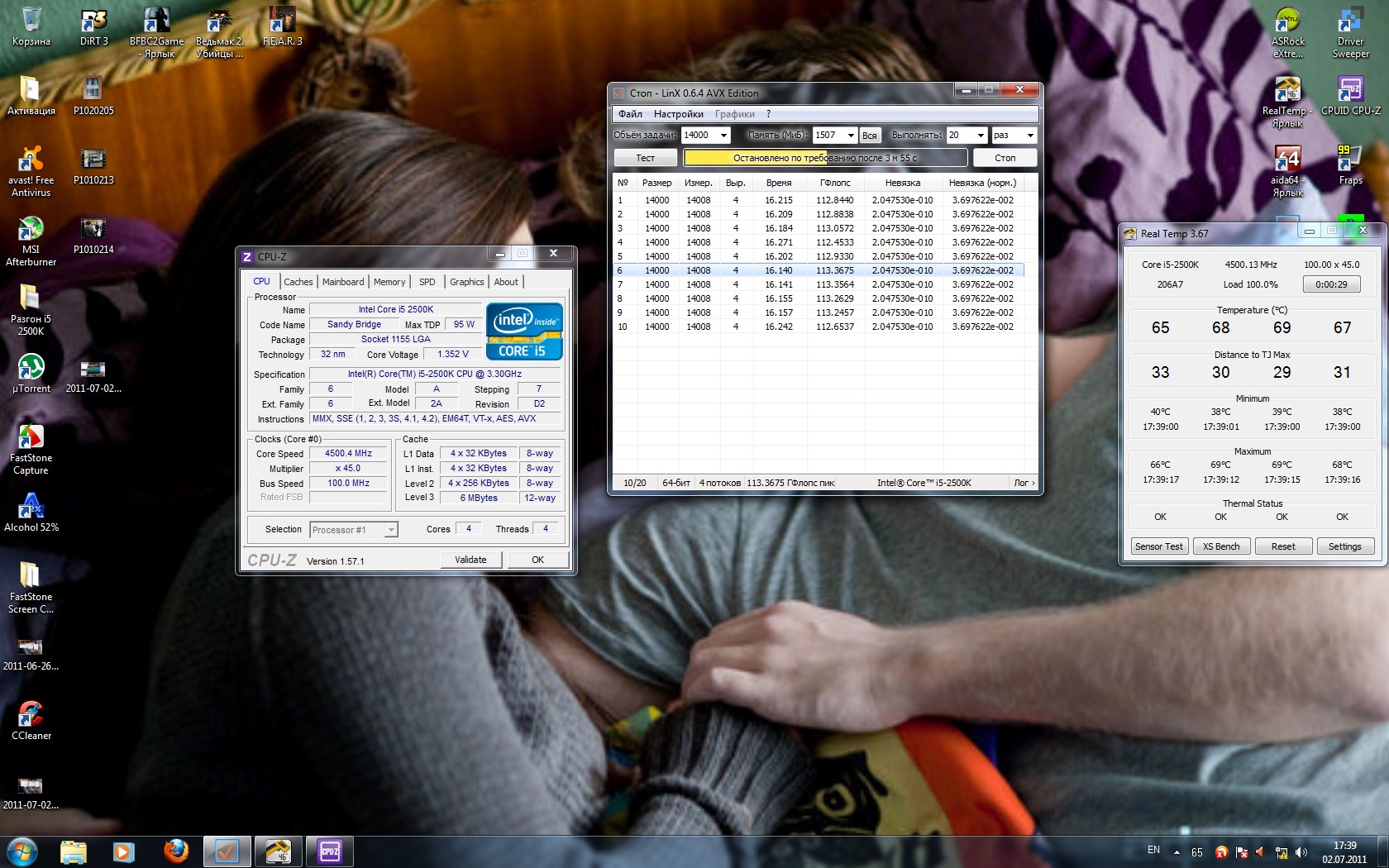 Maxi Jazz много эмоций и мало инфы. Телепатов здесь нет. Какой БИОС, какая Винда, какой Линкс, какие настройки у вас. Clear CMOS + настойка памяти + авторазгон + LinX из фака по Сенди / со стандартными для скринов настройками : http://people.overclockers.ru/Xmast/record7