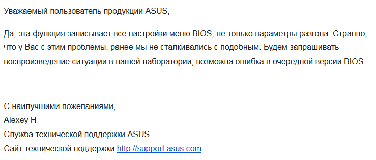 Плата Asus z170 deluxe. При попытке сохранить настройки Bios ( ASUS Overclock Profile) находясь в bios на Usb накопитель ,ничего не происходит.Причём bios определяет usb накопитель и его структуру.Появляется окно с вопросом "сохранить ?" и при нажатии "ок" настройки не сохраняются.Ошибки не выдаются....просто ничего не происходит..Пытался использовать несколько usb накопителей с файловыми системами fat32-ntfs-exfat. Решения до сих пор нет.... На данный момент вышло уже 15 обновлений Bios!