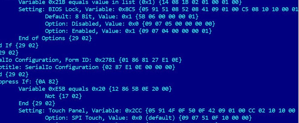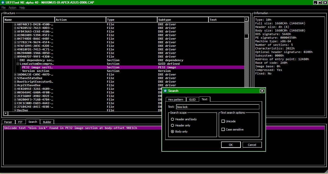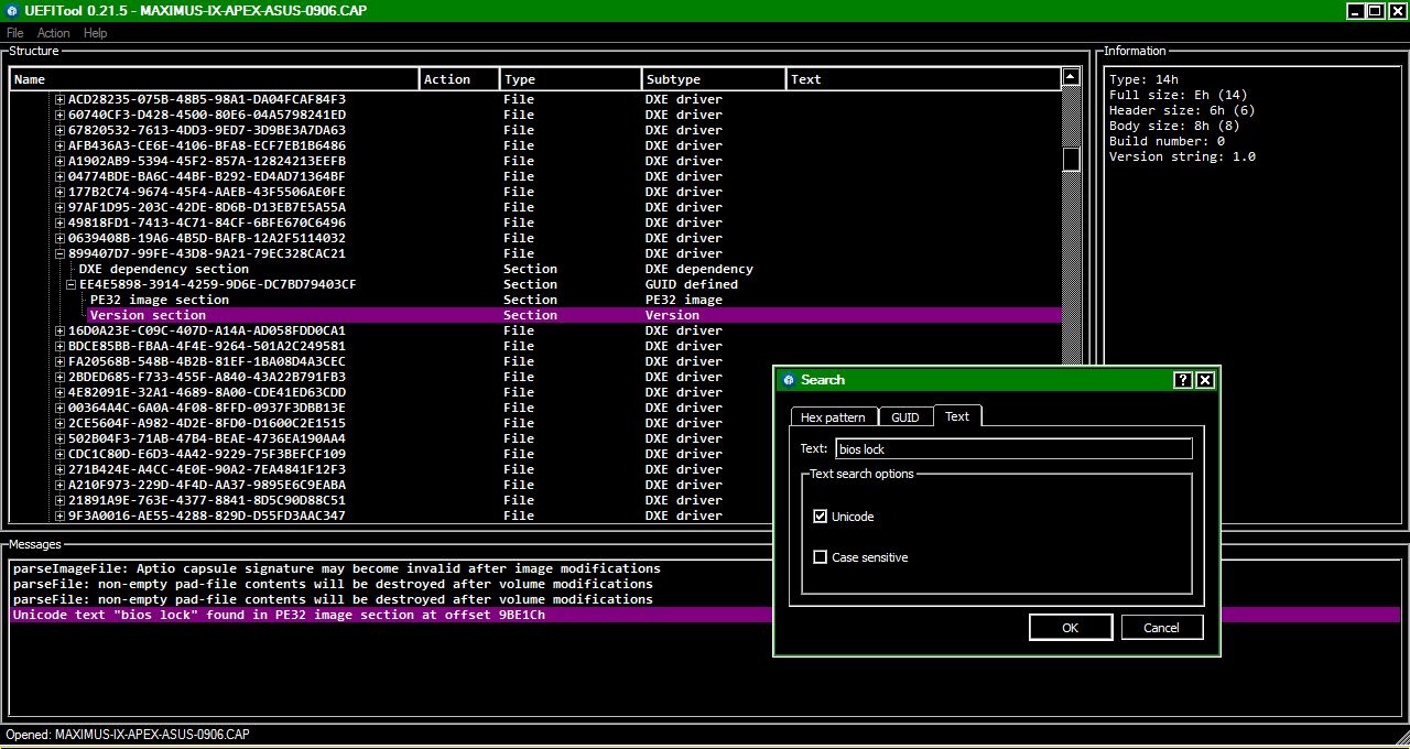 Метод конечно классный, но как воспользоваться им с новыми биосами для z270. через UEFITool никаких описаний нет (как собственно и через MMTool) в итоге как искать текст))) да и по GUID болт. В принципе для Aptio 5.12 уже пошли трудности. даже с AMIBCP 5.02.x проблемы, после работы с ним шить биось нельзя. кирпич обеспечен. Новый софт бы, но увы. вообще кругом всё глухо. AMI видать совсем ужесточил контроль.
