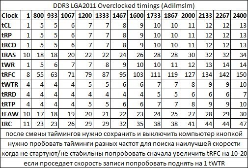 ну и недавно общался с человеком. у него 2.49. память 1866 шитая из 1333 (о чем он тоже даже не подозревал). прекрасно работает на 1866. настройки таймингов в материнке нет поэтому память работает на 13-13-13-32. его знакомому тоже заказали комплект 2011, приехала мать 6.11, начали проверять с этой памятью. на 1866 уходит в синьку с такими же таймингами которые были на 2.49. удалось запустить по табличке от Adilmslm с таймингами от 2000мгц 11-11-11-30. также не стоит забывать про второстепенные тайминги. их тоже нужно править