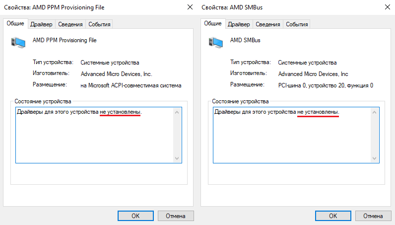 Проверь у себя в диспетчере устройств - у этих конкретных устройств пишет "Устройство работает нормально" или написано то же, что у меня на скриншотах?