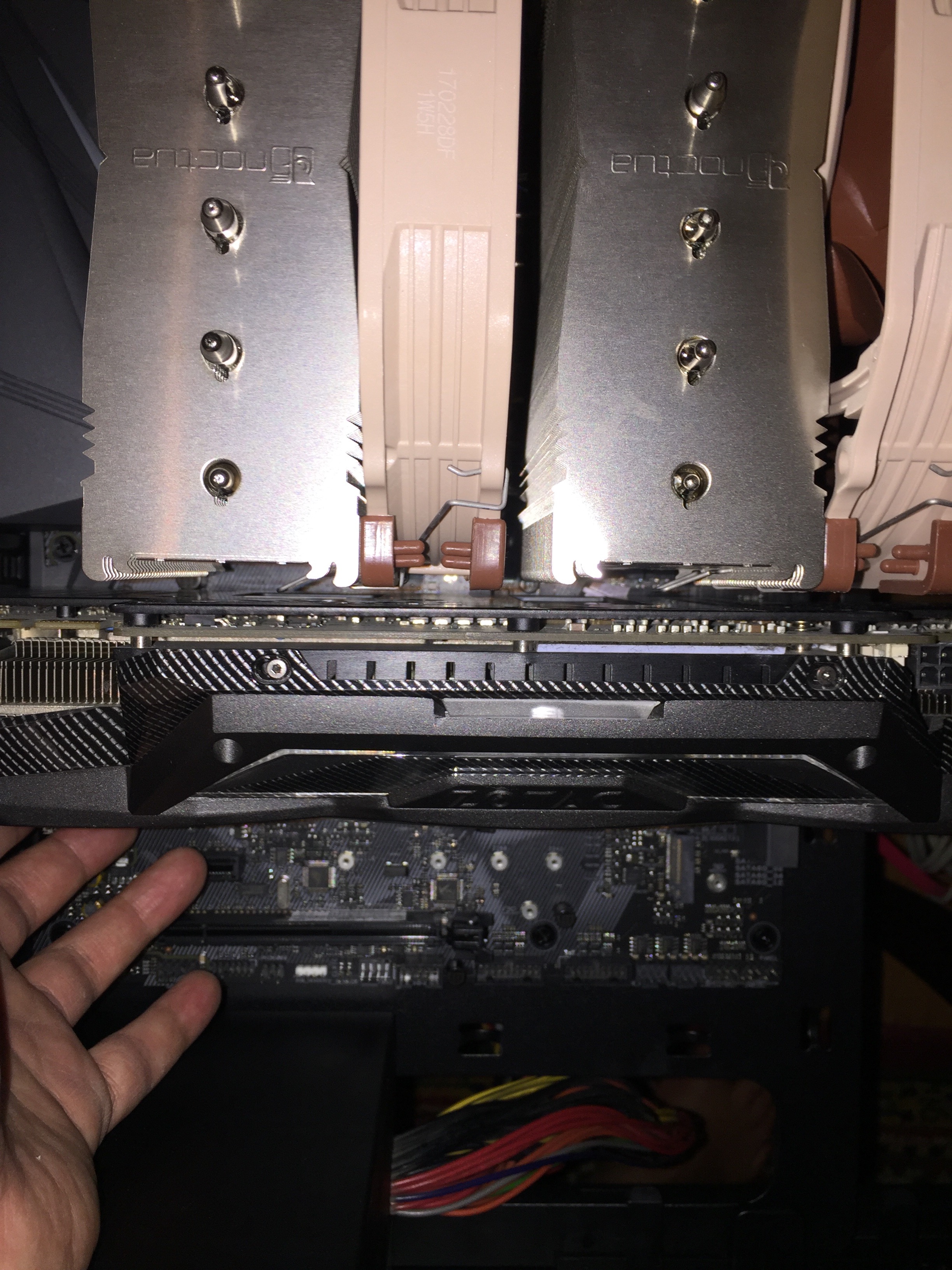 Noctua NH-D15 SE-AM4 на ROG Strix F Gaming встала впритык к крышке видеокарты (видюха установлена на первом РCI-E), но все работает))