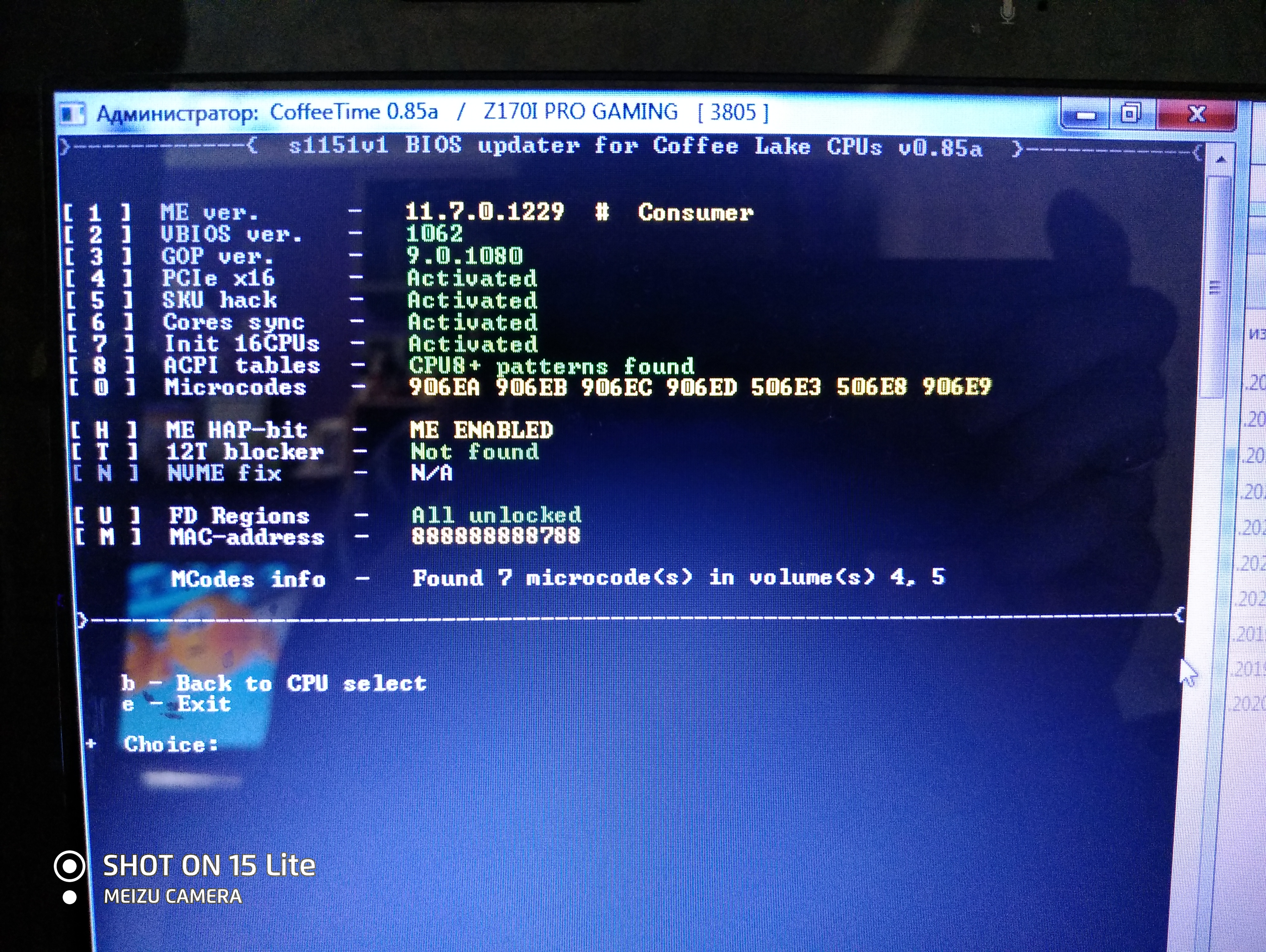 В этом случае нужно добавить необходимый микрокод через Advanced mode. Вводим «0», потом удаляем все микрокоды, введя «0», далее добавить те, которые Вам нужны, исходя из ревизии (пункт 3.1 Ревизии Coffee Lake). Количество места под микрокоды ограничено, поэтому обычно можно добавить не больше трёх, зависит от биоса мат.платы. Завершаем модификацию, если больше не требуется никаких изменений, после ввода «e». #77 Модифицированный биос можно считать готовым!