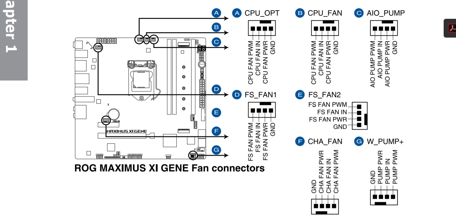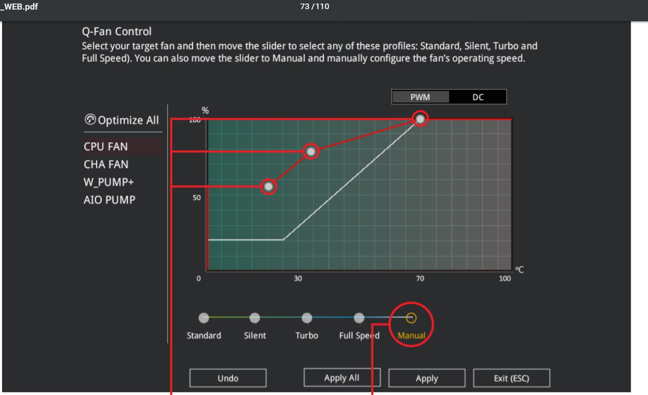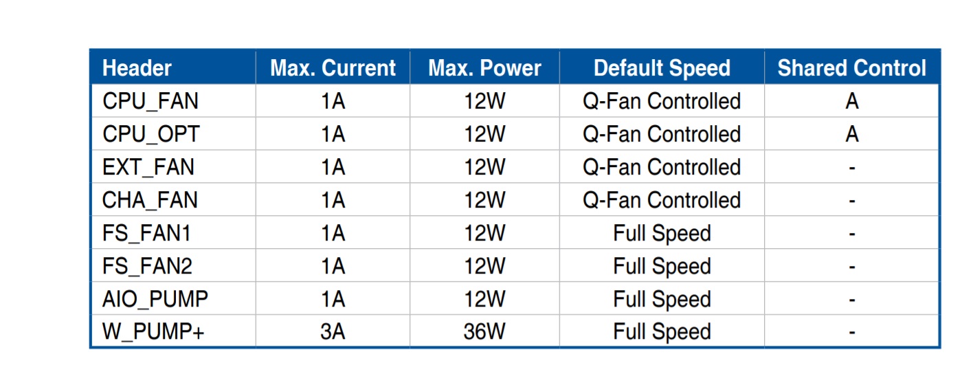 По факту все в мануале есть. Разъемы, которые указаны в таблице как Q-Fan Controlled, сразу по умолчанию завязаны на "кривую" регулировки. Остальные разъемы по умолчанию на 100% вращения, но никто не запрещает в биосе переключить их в режим Q-Fan. Так же никто не запрещает подключать вентиляторы в разъемы AIO и W pump.