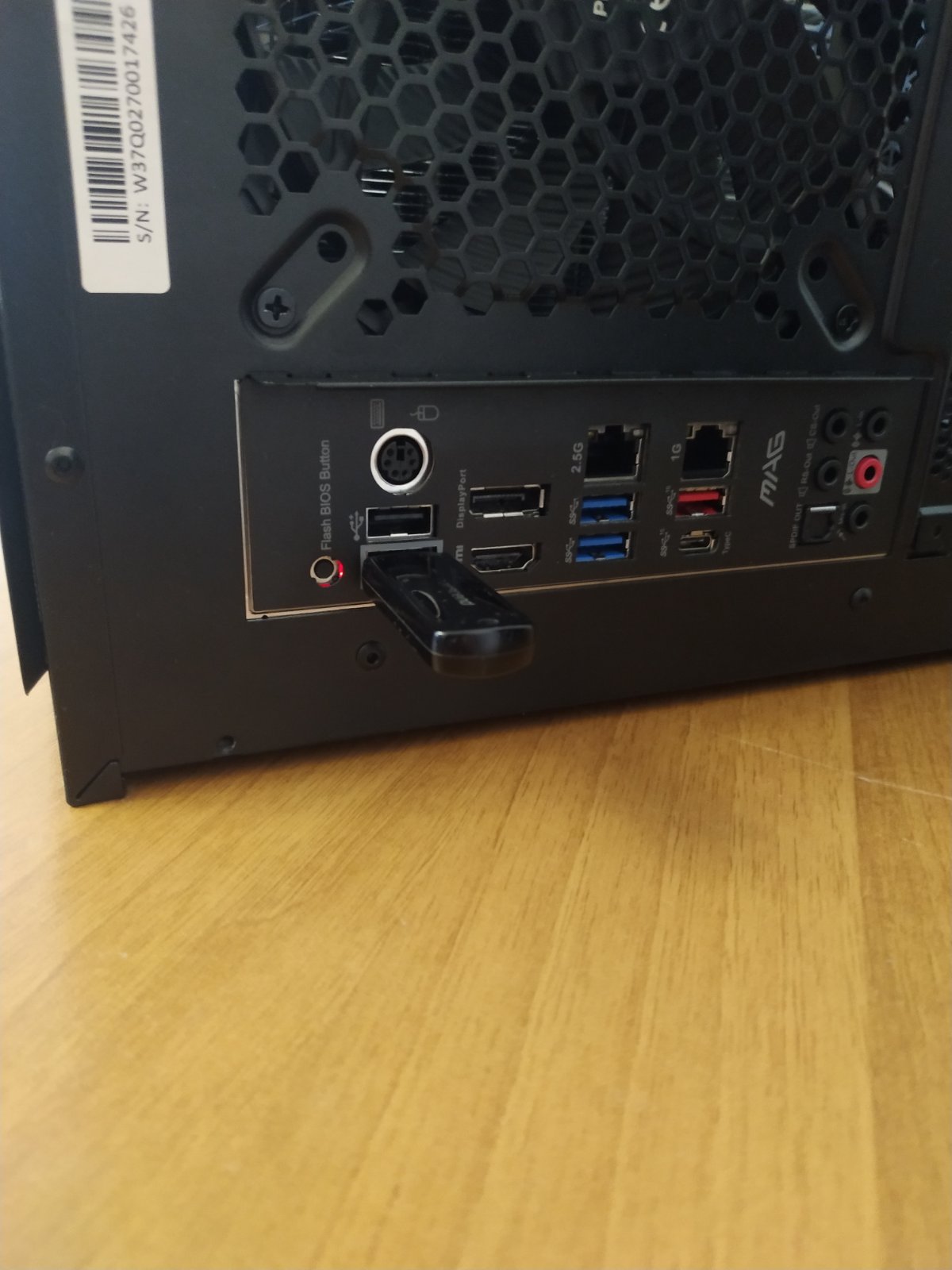 1) Флэшка любая, у меня вообще microSD карта в USB-адаптере, 32ГБ, отформатирована в ФАТ32(это обязательно) кластер стандартный. Записан в корень только файл биоса , переименован в MSI.ROM 2) С материнки снято все - проц , память, nvme, видеокарта. Подключен БП к разъемам питания cpu и atx .(msi говорит, что комплктующие могут быть вставлены. Не проверял) 3) БП включен , но не стартован(вентили не крутятся, можно включить в молекс что-нибудь светящееся как индикатор). 4) Вставляем флешку в flash bios port, жмем flash bios button 5) индикатор flash мигает секунд 5, потом БП стартует сам (вентили крутятся, питание в молексах есть) 6) индикатор flash мигает минут 5-20 (не засекал) 7) БП останавливается, стартует заново, но индикатор flash уже не горит - значит биос прошит, можно выключать БП