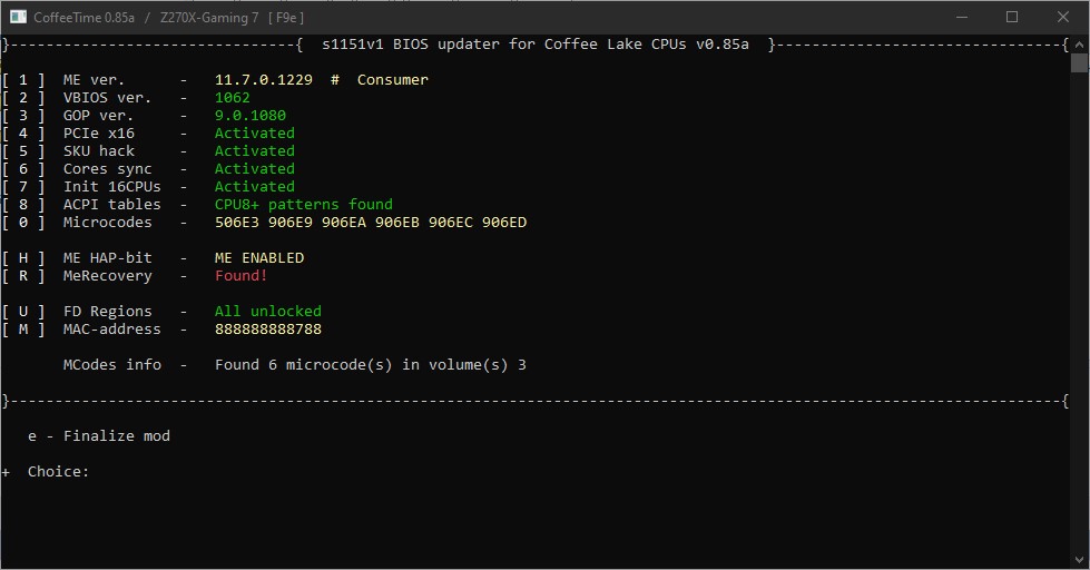 Для плат на базе чипсетов Z370, B365 и H310C можно добавить поддержку процессоров Skylake и Kaby Lake. Для этого достаточно понизить версию МЕ и добавить необходимые микрокоды.