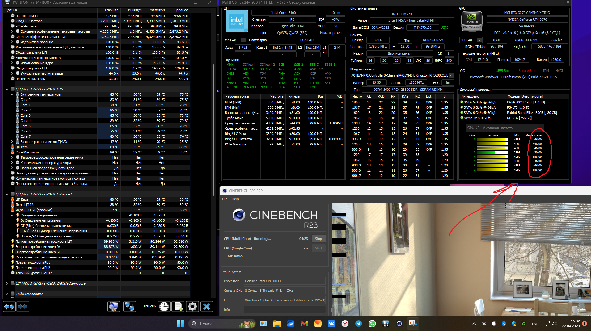 Погонял cinebench 10 минут, ядра максимум 89гр. потребление 90ватт ограничено, все время держал частоту 4.6, иногда одно-два ядра отскакиваю, но быстро возвращаются