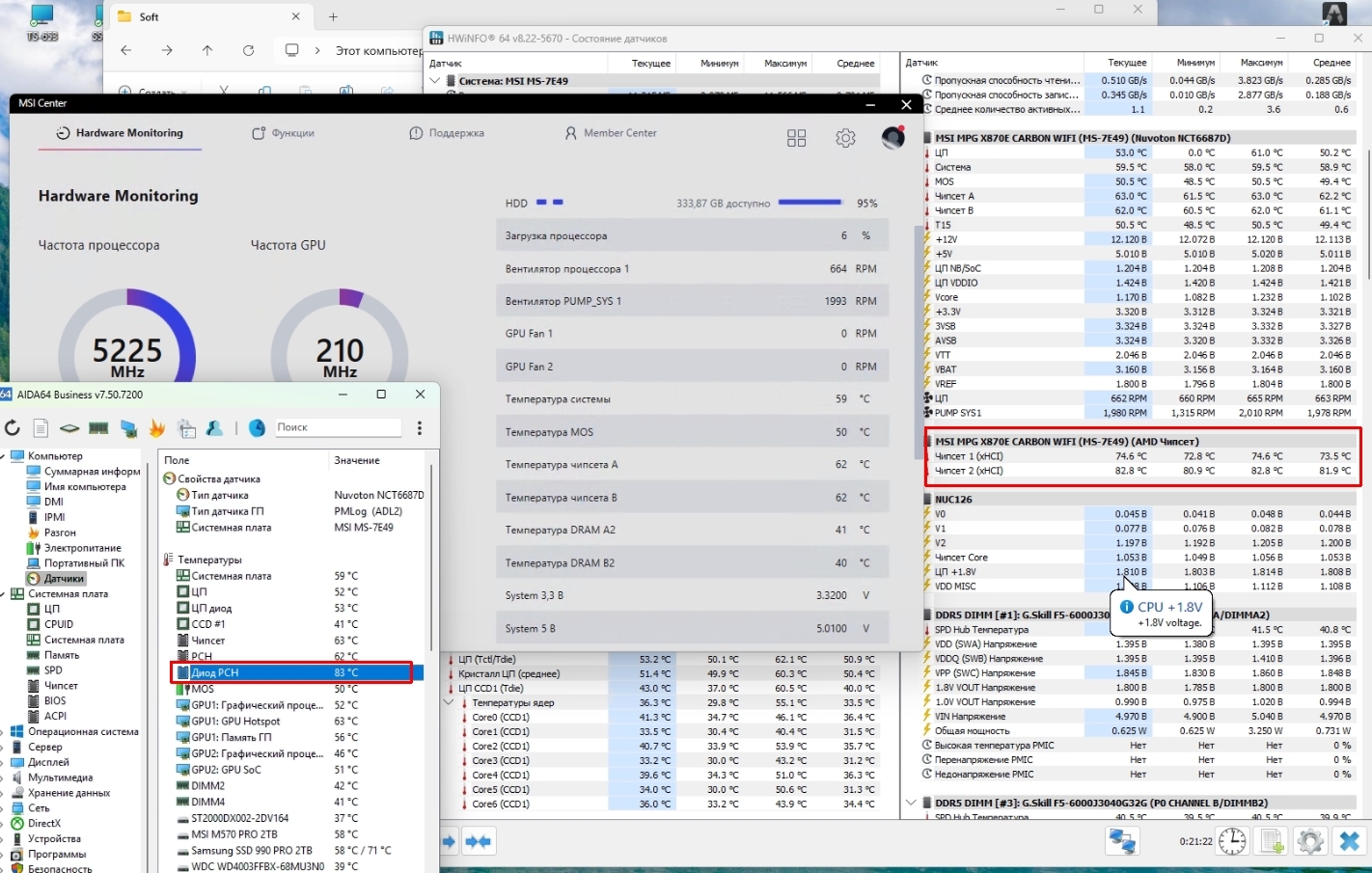 Наблюдаю такую же картину на MSI X870E Carbon. 3 nvme ssd (pci-e 5.0, 4.0 и 3.0) , 2 sata hdd, если это важно. В AIDA64 есть Chipset, PCH и diod PCH, и последний словно находится в главной топке ада.