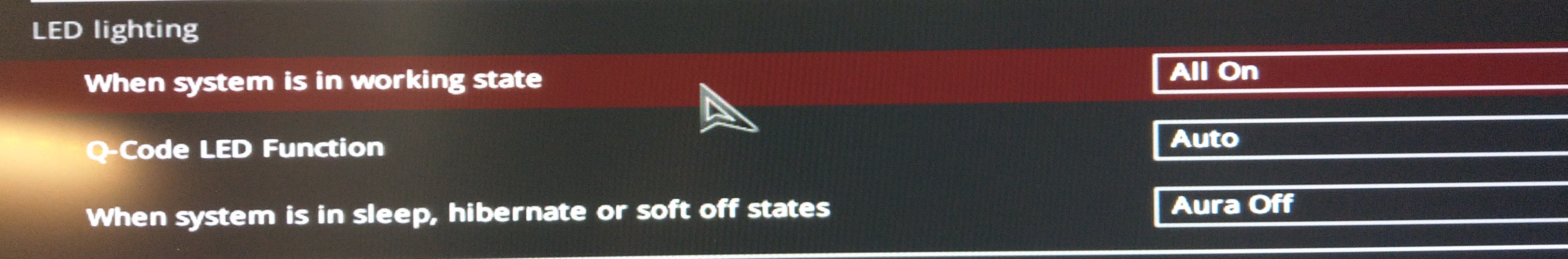 В биос вкладка дополнительно-конфигурация встроенных устройств - led lights выставить все как на скрине, подсветка мп при вкл пк будет работать, при выкл нет, индикатор пост кодов на мп будет при старте запуска системы показывать пост коды, а при загрузке на раб. стол винды температуру проца.