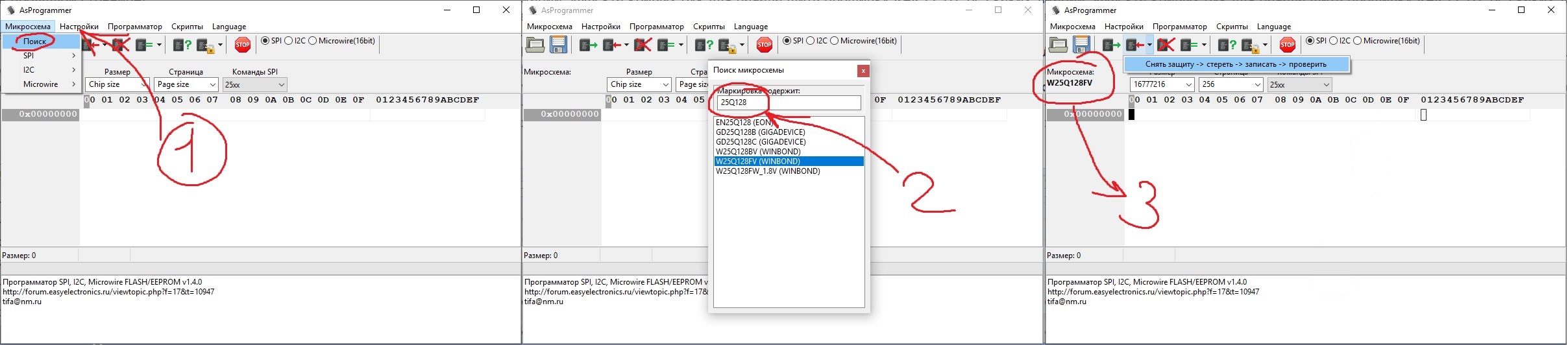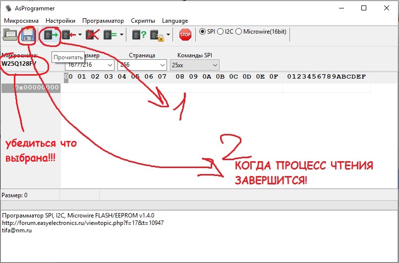 Сначала выбираешь микросхему - у меня это 25q128fvs, у тебя может быть другая: маркироввка есть на корпусе микросхемы и в программе она может НЕМНОГО отличаться (может нехватать какой-то из букв, это норма), смотри какая маркировка у тебя. Следом убеждаешься что микросхему выбрал.