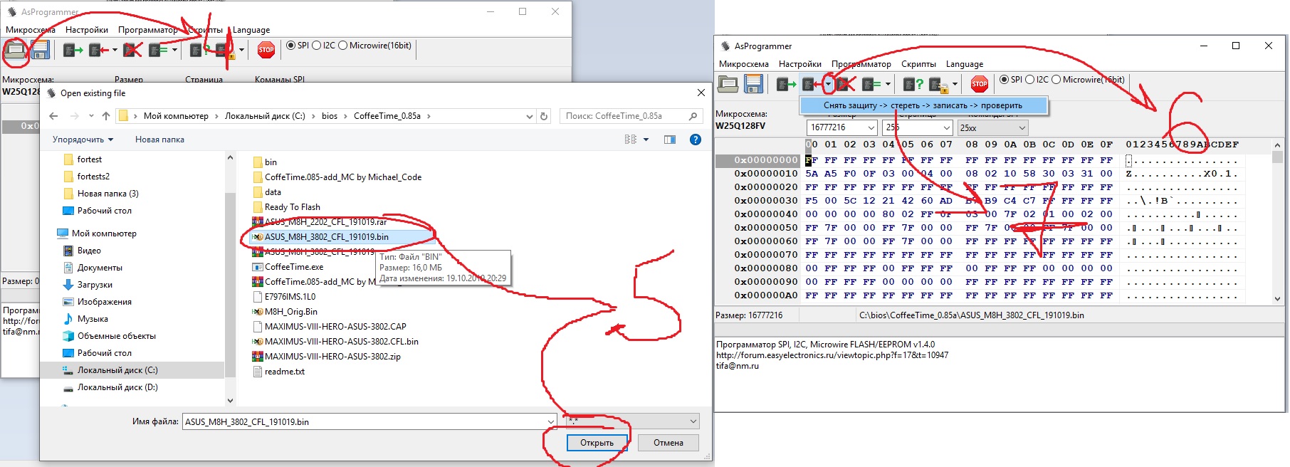 Далее открываешь файл прошивки. Далее жмёшь на СТРЕЛОЧКУ рядом с красной кнопкой, там выбираешь "Снять защиту -> стереть -> записать -> проверить", начнётся процесс прошивки. А ты отходишь от компьютера, и ничего не делаешь, пока процесс не заввершится! Пока микросхема прошивается - вынь батарейку биоса из платы. Когда микросхема прошьётся - вставь её в свою кроватку соблюдая метку, вставь на место батарейку биоса, и включай. ВСЁ