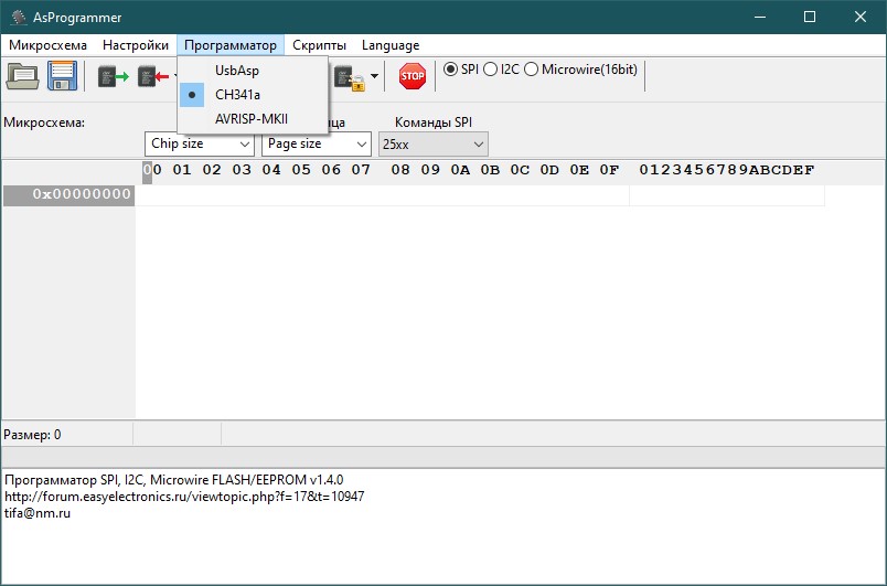 Для CH341A рекомендуется использовать программы: - CH341A Programmer v1.18 [Скачать] - AsProgrammer [Скачать] - Colibri [Скачать]