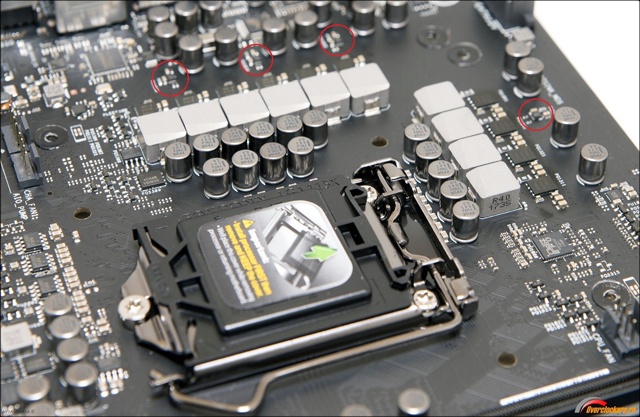 На процессор подается питание с восьми фаз, состоящих из объединяющей верхний и нижний мосфеты микросхемы Infineon NexFET BSG0812ND, выдающие по 50 А каждый. Все подключены через удвоители, поэтому задействуют только четыре канала ШИМ-контроллера.