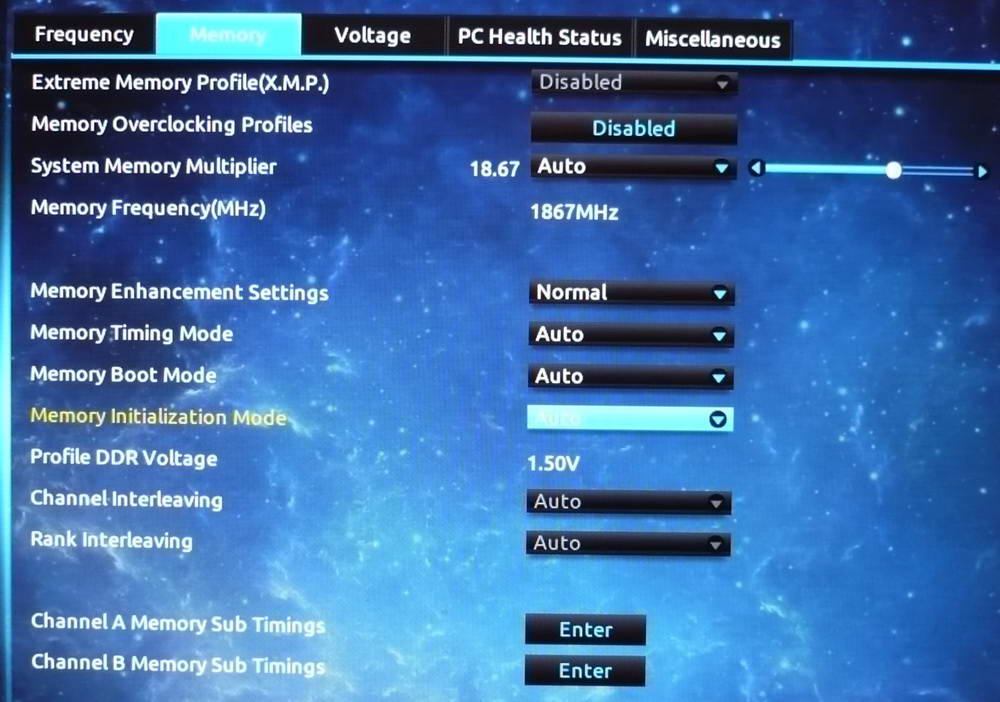 Насчет Kingston HyperX Fury HX318C10FB/4 Память имеет особенность. Ее "паспортные" DDR3-1866 CL10-11-10-... прописаны в spd как штатные тайминги, никаких xmp профилей. Что с этим делает биос F6 сабжевой материнки (все в авто): тупо запускает память на 1866 МГц CL10-11-10 @ 1.5V. Вот такая особенность материнки с F6. При том, что haswell в принципе имеет официальное интеловское ограничение частоты памяти 1600, а G3258 вообще 1333 МГц. И по-хорошему эти цифры биос, программируя в POST'e контроллер памяти дожен бы учесть. Запуститься безопасно, а дальше пусть юзер своими ручками...