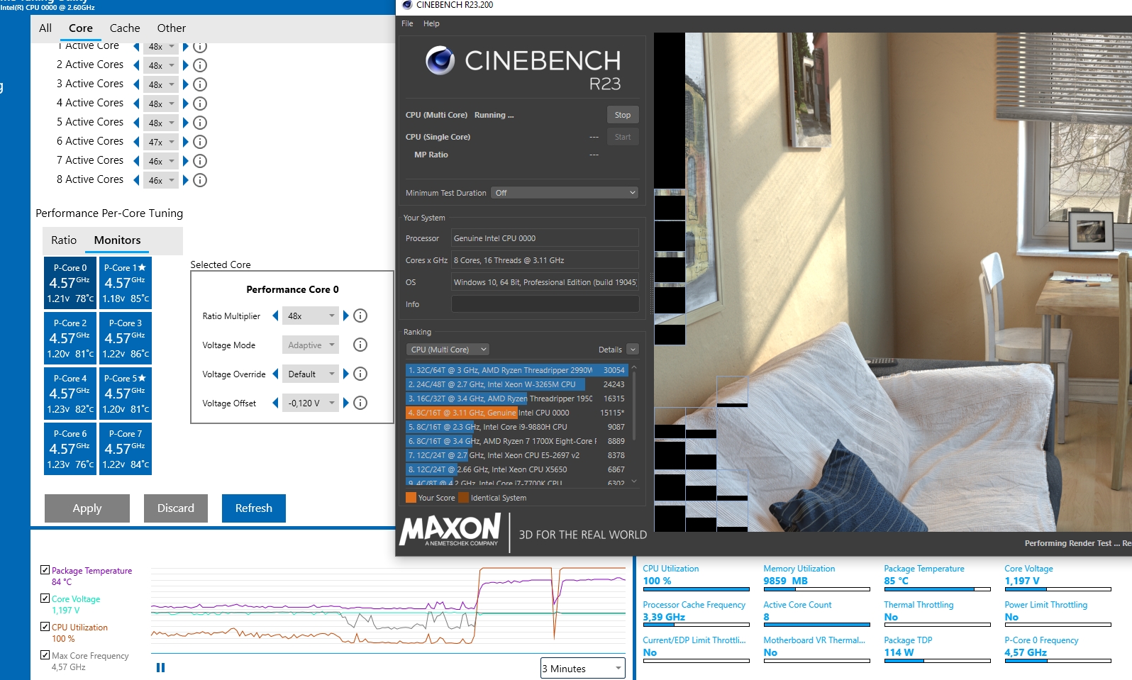 Здесь ведь кроме процессора ничего больше энергию фактически не потребляет. Даже если у Вас мощная видеокарта, её вычислительные способности не используются в Cinebench. В результате, со всеми вентиляторами и т.п. система должна потреблять из сети не более 200 Вт, по прикидкам. Что ж за бесперебойник у Вас такой слабый?