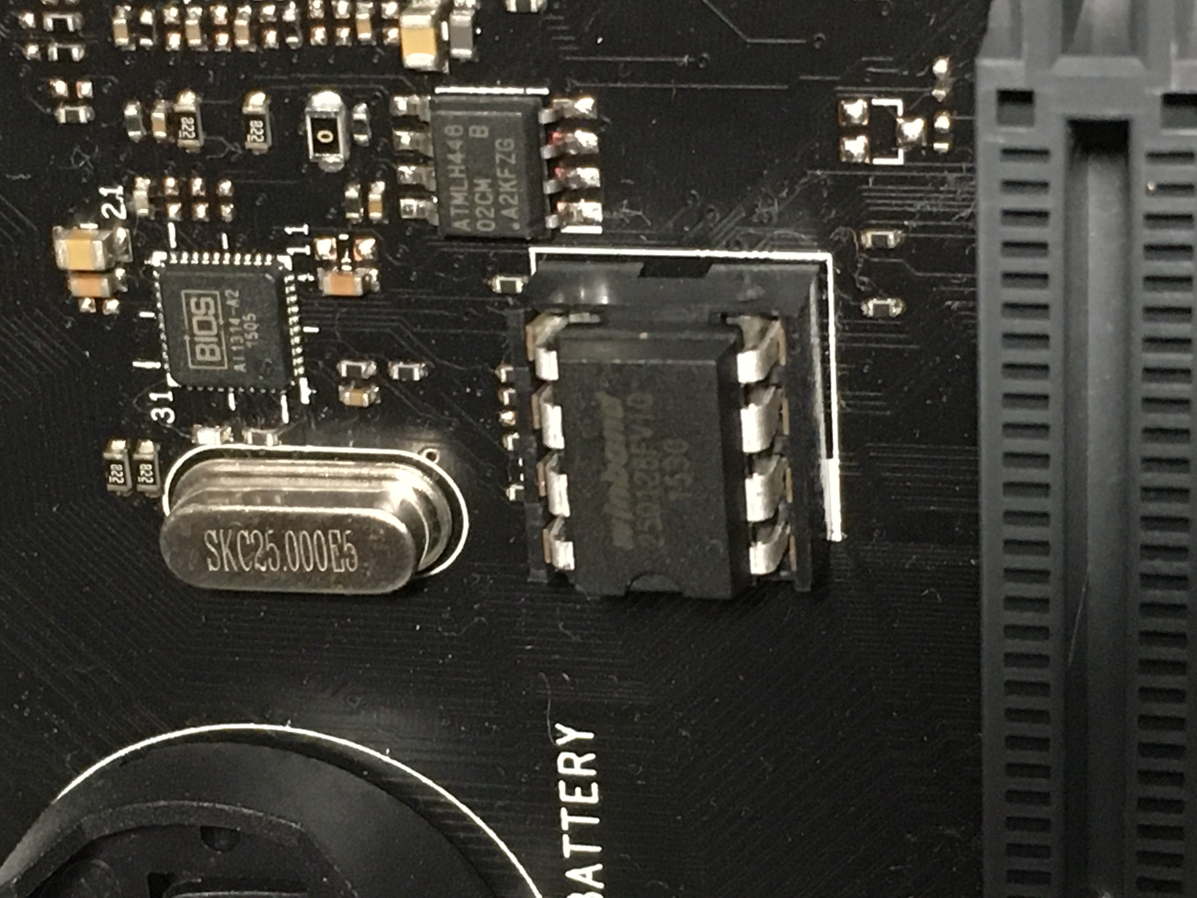 Некоторые платы с распаянным чипом биоса (например ASRock 200-серии) плохо поддаются прошивке через прищепку или JSPI из-за недостаточного питания. В этом случае может помочь возврат на место батарейки или подача дежурного питания с колодки 24-pin.