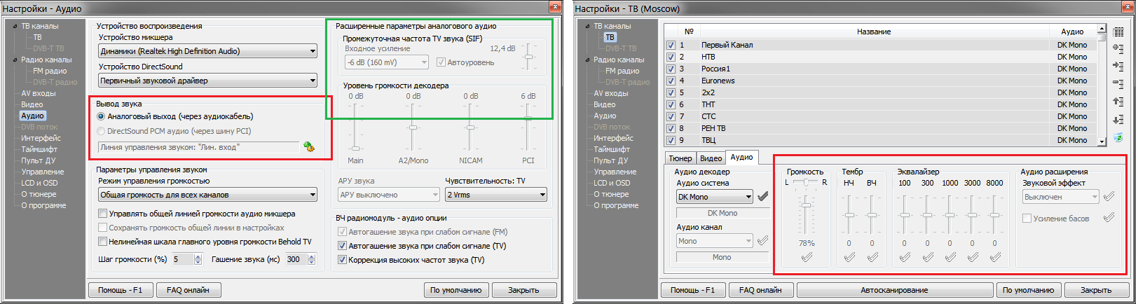 Настройки микшера воспроизведения и линии управления звуком также актуальны и в том случае, когда используется передача звука по системной шине. Несмотря на то, что управление громкостью и гашение звука при этом реализовано исключительно программными средствами через DirectSound, программе Behold TV всё равно необходимо знать, к какому входу аудиоплаты подключен тюнер, т.к. при передаче звука по шине аудиоплата не управляется и выбранный вход должен быть отключен. Помимо выбора микшера, при воспроизведении звука средствами DirectSound актуальна ещё одна настройка тюнера - DirectSound устройство вывода звука. Если в компьютере установлено несколько звуковых карт, то программе тюнера обязательно нужно указать, через какую аудиокарту (DirectSound устройство) воспроизводить звук. Название аудиокарты как правило фигурирует в полном названии DirectSound устройства и может совпадать с названием аудиомикшера.