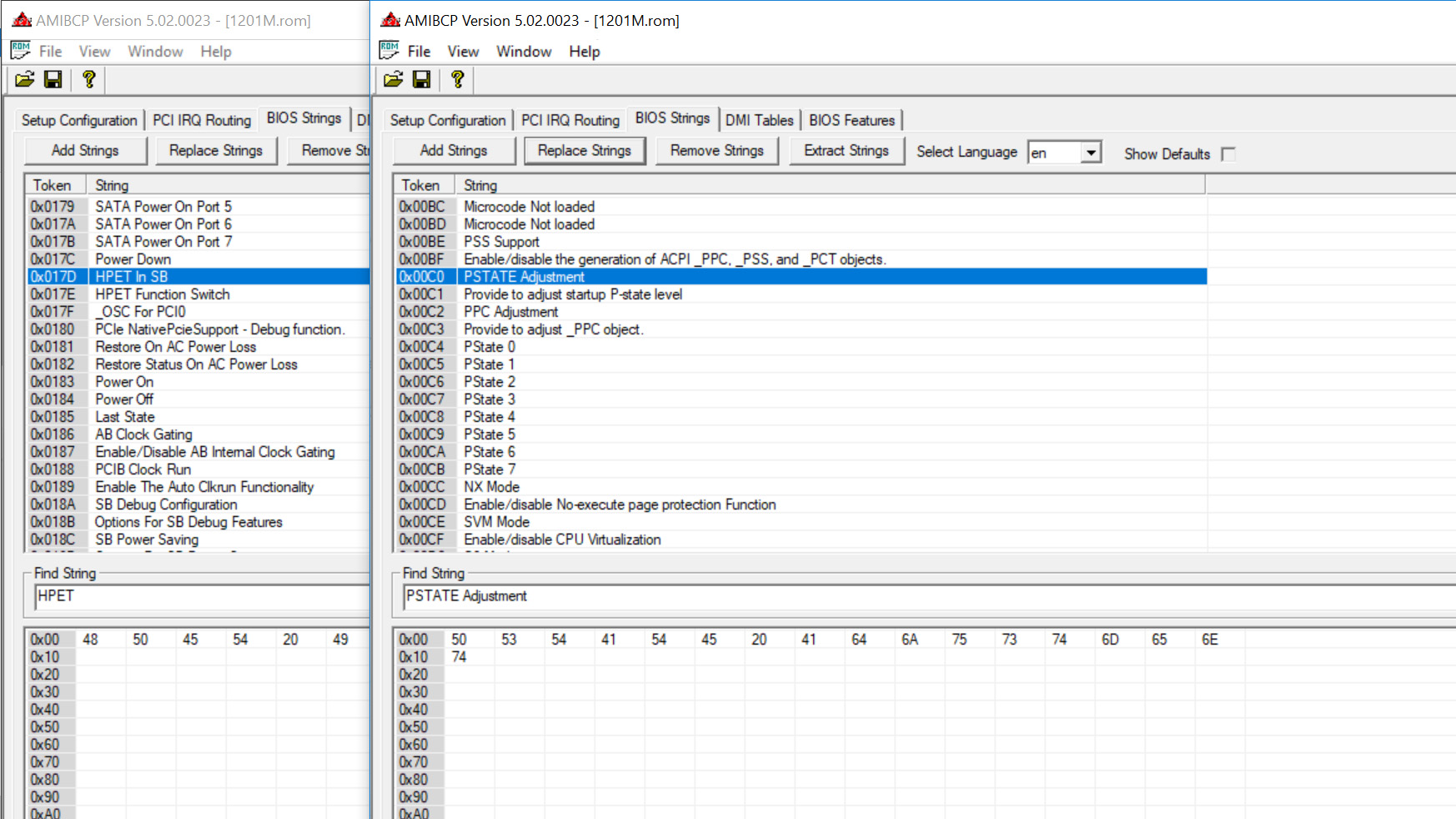 вопрос 1: поясните пожалуйста по AMIBCP, хочу заменить строки HPET In SB с функционалом на PSTATE Adjustment