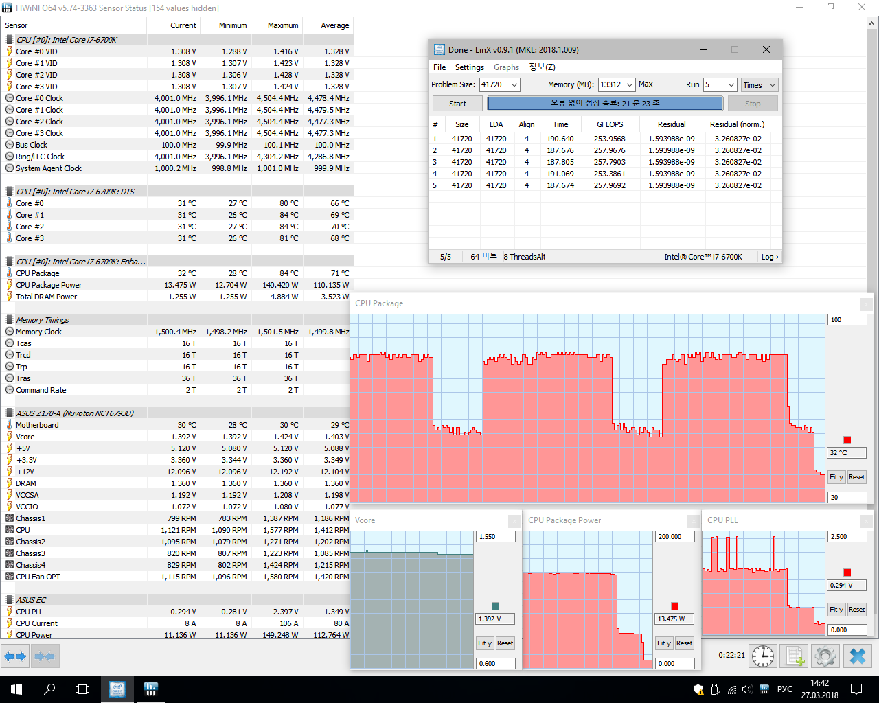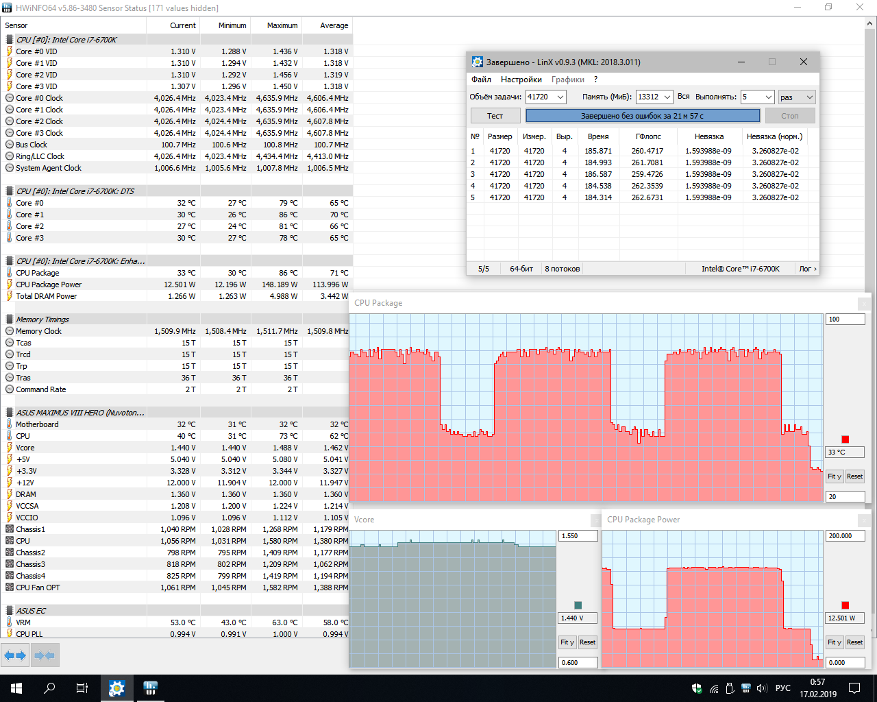 Сходу лупанул по видавшему виды 6700к линпаком на околоопасном вольтаже, чтобы затестить материнку под нагрузкой. Ожидал увидеть долбление в соточку)), но получил вполне сносные температуры, как со старой мамкой на заметно меньших вольтажах и частотах. Действительно, топовая материнка вытянула никакой по удачности экземпляр с дефолтным VID'ом 1.312. Может и 9900K когда-нибудь вытянет...