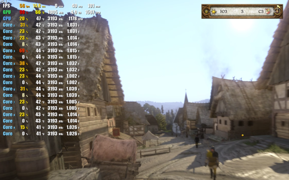Вчера гонял Kingdom Come на максимальных настройках. У меня на видяхе 1660 Super проц 2678 с анлоком выдает примерно 60 FPS, проц не загружается выше 15%,