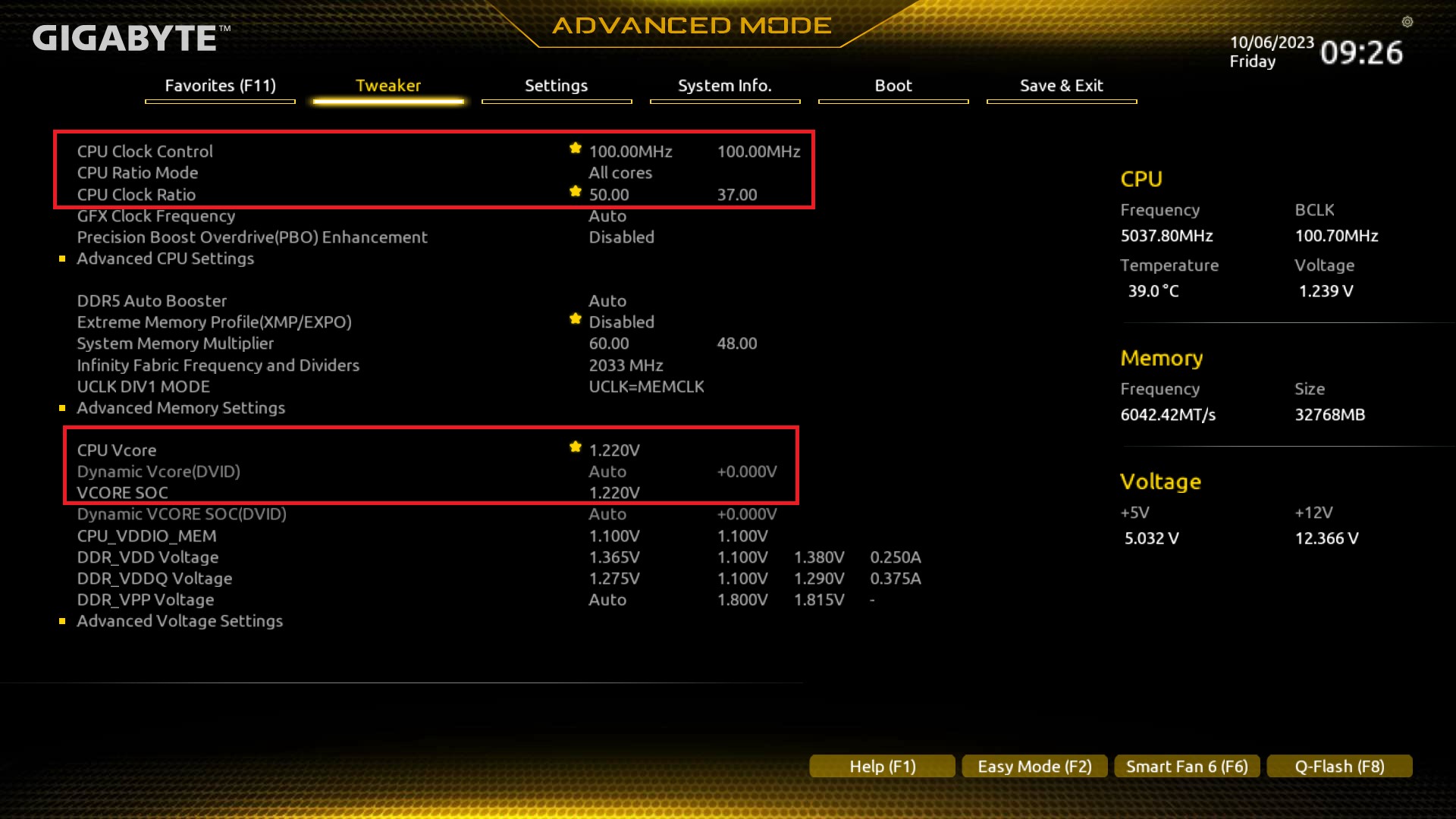 Izelop если именно настроек процессора, то обведенное красным. У меня на работе тоже b650m ds3h + 7500f. Я сделал фиксированную частоту 5000 - Cpu clock ratio 50. Чтобы не плавала частота шины выставил 100 мгц - Cpu clock control 100. Подобрал напряжение на процессор, при котором я могу пройти тест в синебенч р23\р24 без бсода и еще и охлад gammax 400 v2 справляется - у меня получилось CPU Vcore 1,22. А когда настраивал память, то поймал стабильность на 1.21 вольта у SOC, но накинул сверху еще запас - Vcore Soc 1.22.