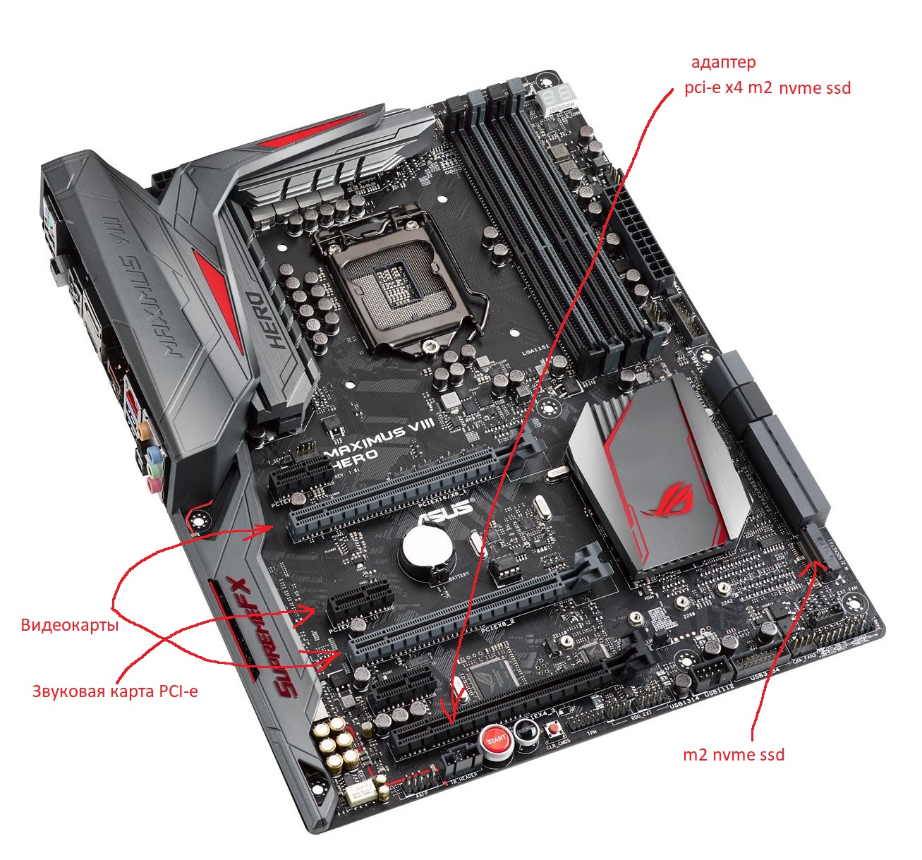 Помогите пожалуйста разобраться - имеется мат.плата maximus 8 hero. Процессор - 7700к. m2 ssd nvme (в разъеме м2), 2 видеокарты в слай в разьемах pci-e x8, звуковая карта в pci-e x2 и 3sata ssd. При попытке подключить еще один м2 ssd nvme адаптер в разъем pci-e x4 (самый нижний) - отваливается звуковая карта - она как бы работает (горят диоды подсветки выходов), но виндовс ее не видит. При извлечении адаптера pci-e x4 - звуковая работает нормально. Что это такое?