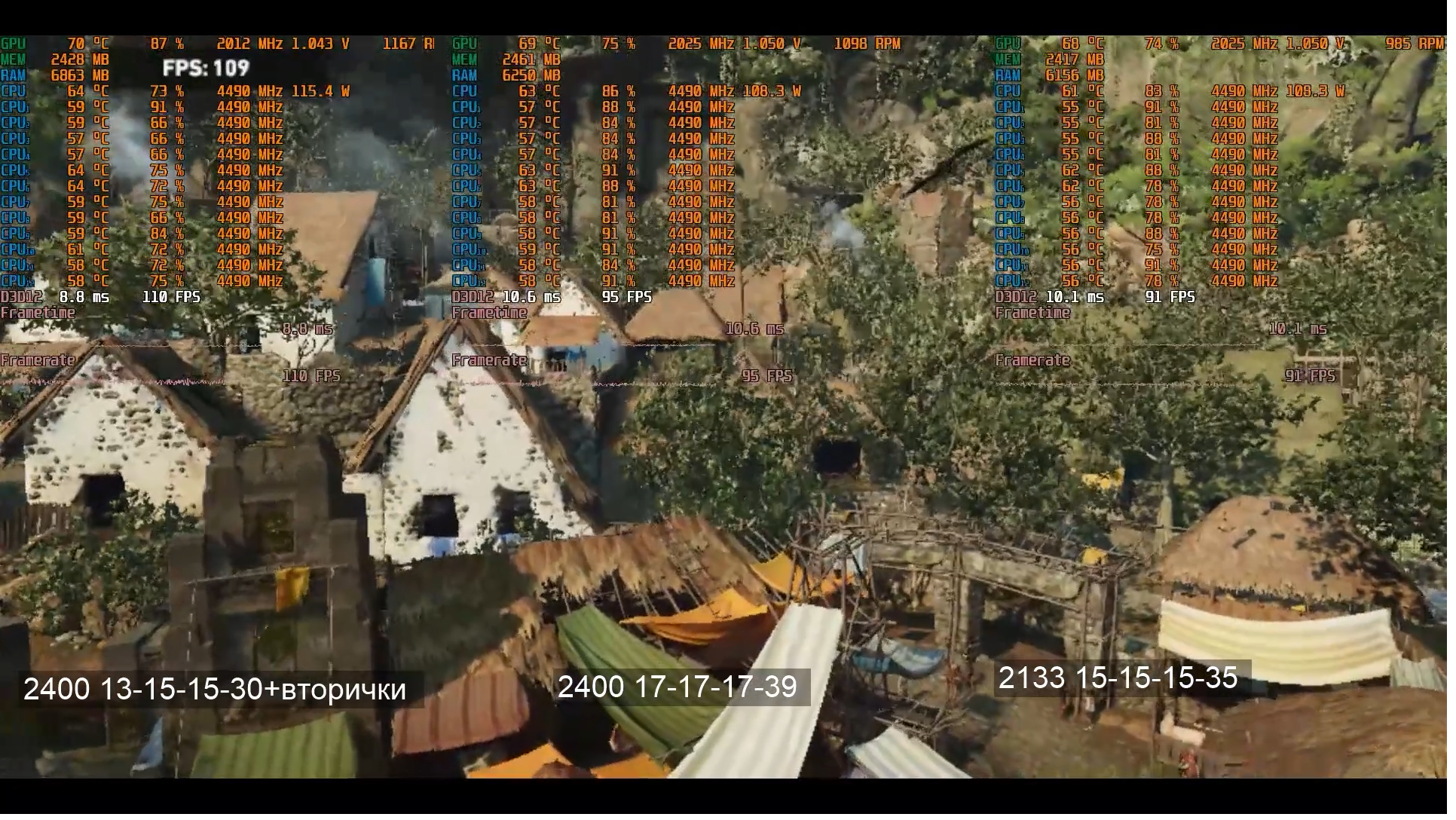 Фига се, разница! Я про 2400 со стоковыми и оптимизированными таймигами. У Вас, я так понял DDR4? Посмотрел запись своего прогона на 1650v3 - на рынке в том же месте, те же 87 ( у Вас 86) кадров, при тойже частоте и примерно тех же таймингах. 2133@ 15-15-15-36 CR3. А что оптимизировали из вторичек на 2400?