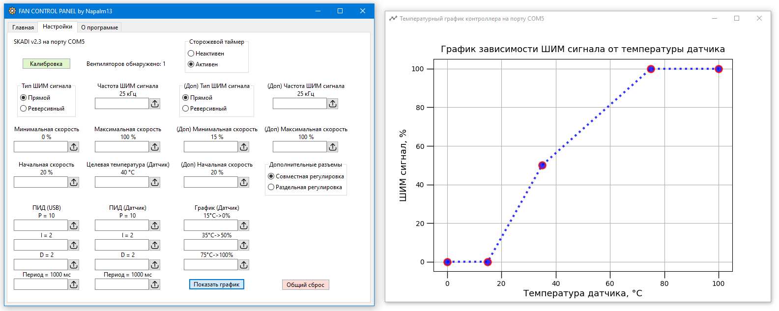 Контроллер работает в паре с управляющей программой, которая: 1) Считывает температуры железа (процессоров, видеокарт) 2) Умеет управлять контроллером от считанных температур 3) При желании каналы управления можно настроить независимо друг от друга от разных источников 4) Можно повесить на канал несколько источников температур с индивидуальными температурными настройками 5) Подключаемый внешний датчик температуры также может выступать в качестве источника для управления контроллером 6) Множество других тонких настроек контроллера (смотрите скрины в конце поста) 7) Программа имеет версии как для винды (10 и старше), так и для ос с ядром линукс (протестировано на убунту 20 и выше, дебиан 12 и выше) 8) Имеется интерфейс командной строки (доступен на всех платформах), и графическая оболочка (доступна только для винды) 9) Программа имеет автозапуск при загрузке ОС 10) Для любителей линукса и скриптов, у программы есть режим трансляции заданной скорости вентиляторов напрямую в контроллер